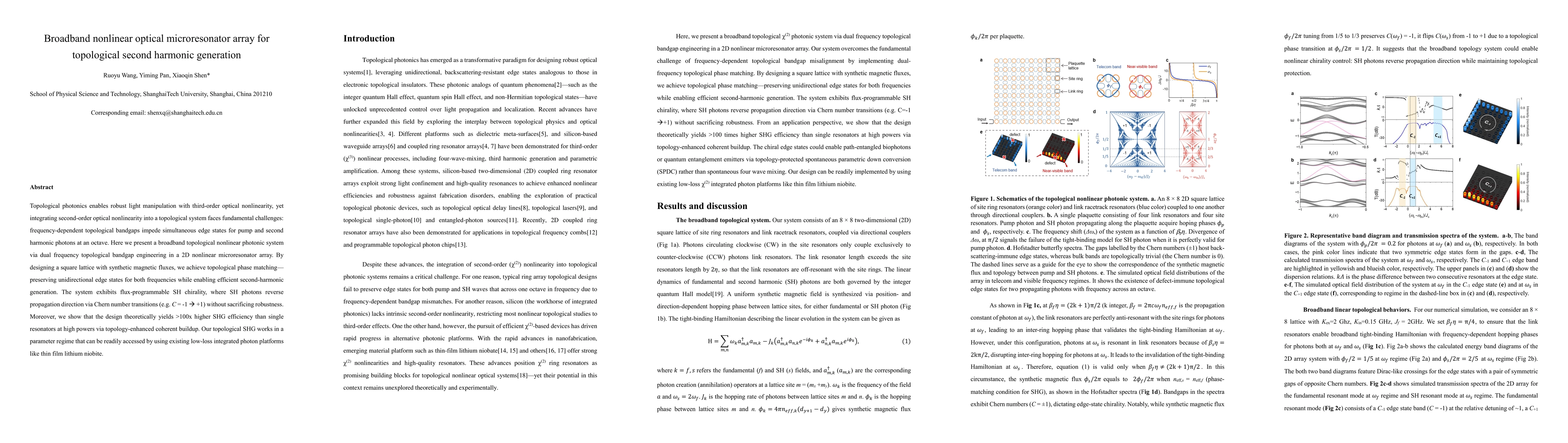 A novel theoretical framework for broadband topological second-harmonic generation in a 2D coupled ring microresonator array was established, demonstrating the feasibility of topological protection for χ(2) processes