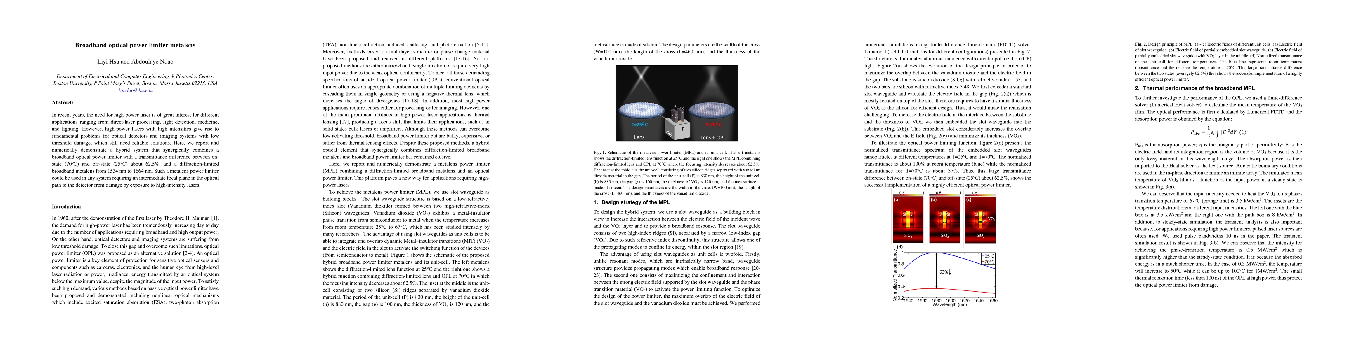 In recent years, the need for high-power laser is of great interest for different applications ranging from direct-laser processing, light detection, medicine, and lighting. However, high-power lasers with high intensities give rise to fundamental problems for optical detectors and imaging systems with low threshold damage, which still need reliable solutions. Here, we report and numerically demonstrate a hybrid system that synergically combines a broadband optical power limiter with a transmittance difference between on-state (70^o C) and off-state (25^o C) about 62.5%, and a diffraction-limited broadband metalens from 1534 nm to 1664 nm. Such a metalens power limiter could be used in any system requiring an intermediate focal plane in the optical path to the detector from damage by exposure to high-intensity lasers.