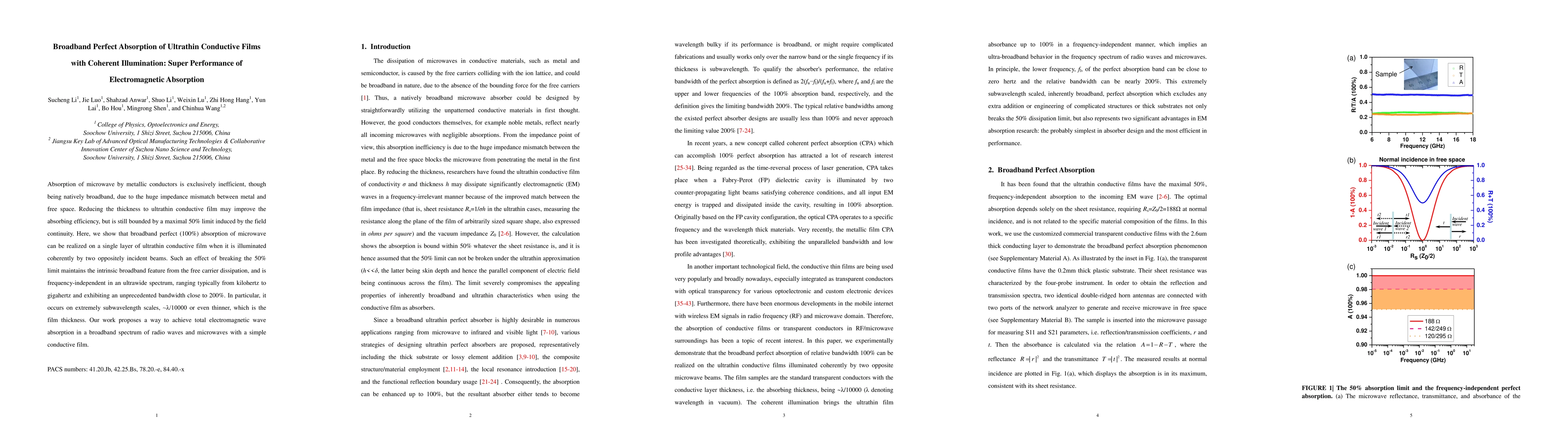 This paper demonstrates that ultrathin conductive films can achieve broadband perfect absorption (100%) of microwave radiation when illuminated coherently by two oppositely incident beams, overcoming the traditional 50% absorption limit. This method maintains a wide absorption bandwidth, extending from kilohertz to gigahertz, and operates on extremely subwavelength scales.