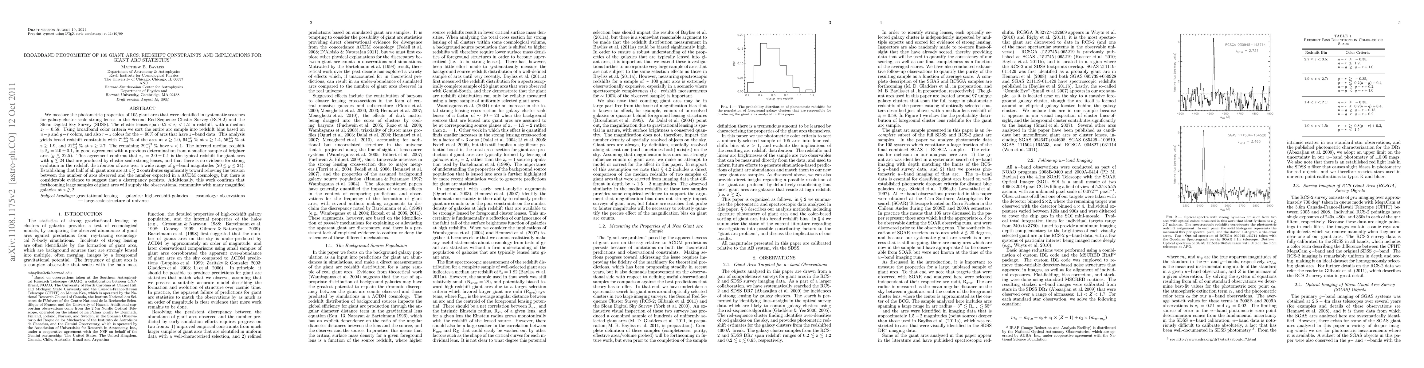 This study measures the photometric properties of 105 giant arcs identified in strong lensing clusters, finding that 71% of them are at redshifts greater than 1.0. The median redshift for these arcs is z_s = 2.0 +/- 0.1, indicating no strong evolution in their distribution, which helps to alleviate some tension in the number of observed versus expected arcs in Lambda-CDM cosmology.