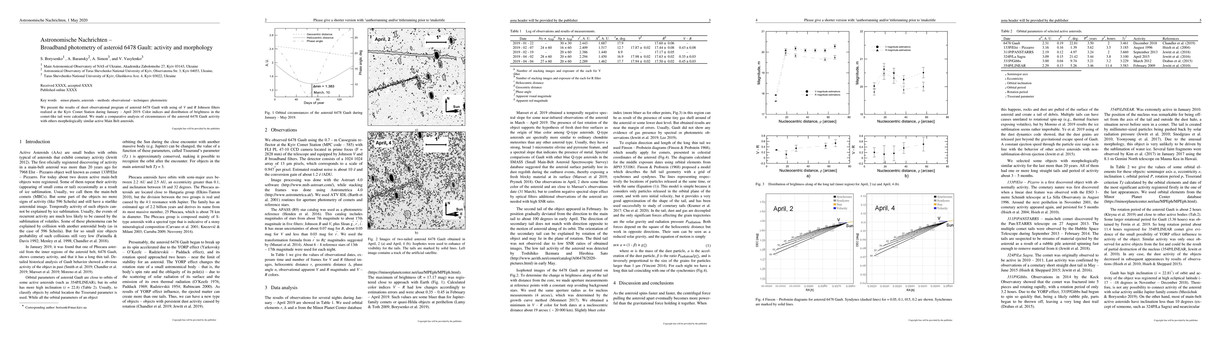 We present the results of short observational program for asteroid 6478 Gault with using of V and R Johnson filters realized at the Kyiv Comet Station during January-April 2019. Color indices and distribution of brightness in the comet-like tail were calculated. We made a comparative analysis of circumstances of the asteroid 6478 Gault activity with others morphologically similar active Main Belt asteroids.