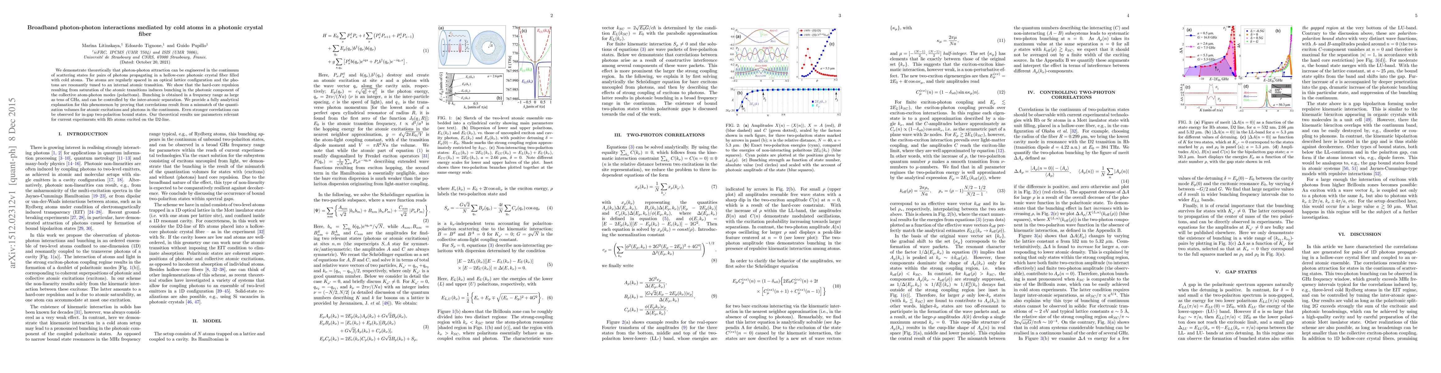 This paper theoretically demonstrates photon-photon attraction in a photonic crystal fiber filled with cold atoms, showing that bunching of photons can be engineered over a broad frequency range by tuning the atoms to an internal transition. The phenomenon arises from a mismatch in quantization volumes for atomic excitations and photons, leading to strong correlations.