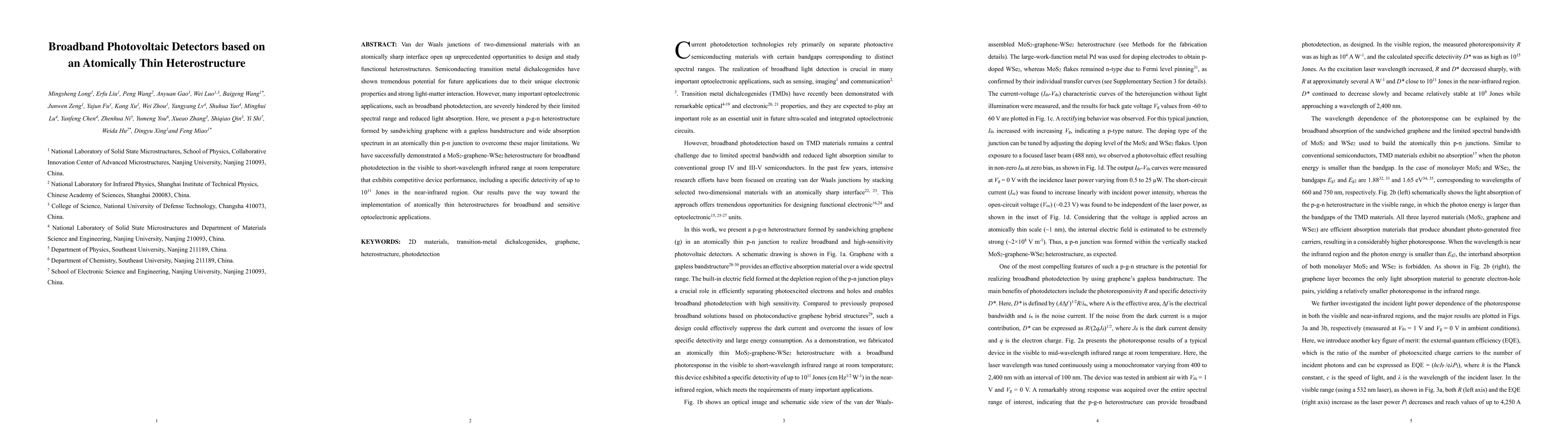 This paper presents a novel p-g-n heterostructure combining MoS2, graphene, and WSe2 for broadband photodetection, achieving high performance and sensitivity in the visible to short-wavelength infrared range, thus overcoming limitations of traditional materials for optoelectronic applications. The demonstrated device shows a specific detectivity of up to 10¹¹ Jones, indicating significant potential for future optoelectronic applications.