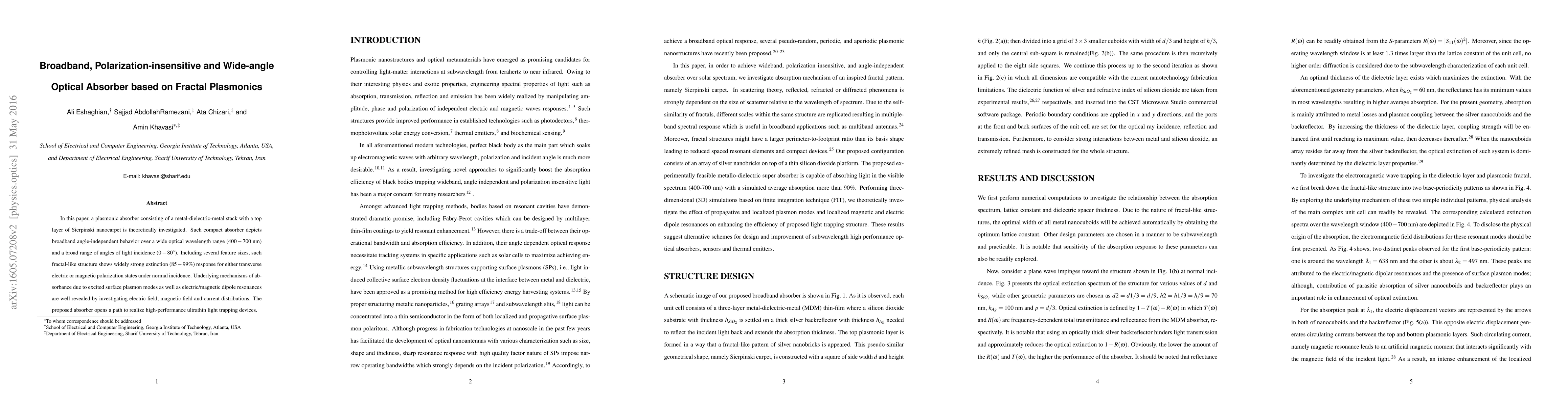 This paper presents a broadband, polarization-insensitive, wide-angle optical absorber based on fractal plasmonics using a Sierpinski nanocarpet structure. The absorber exhibits strong extinction across a wide range of wavelengths and angles, driven by surface plasmon modes and dipole resonances.