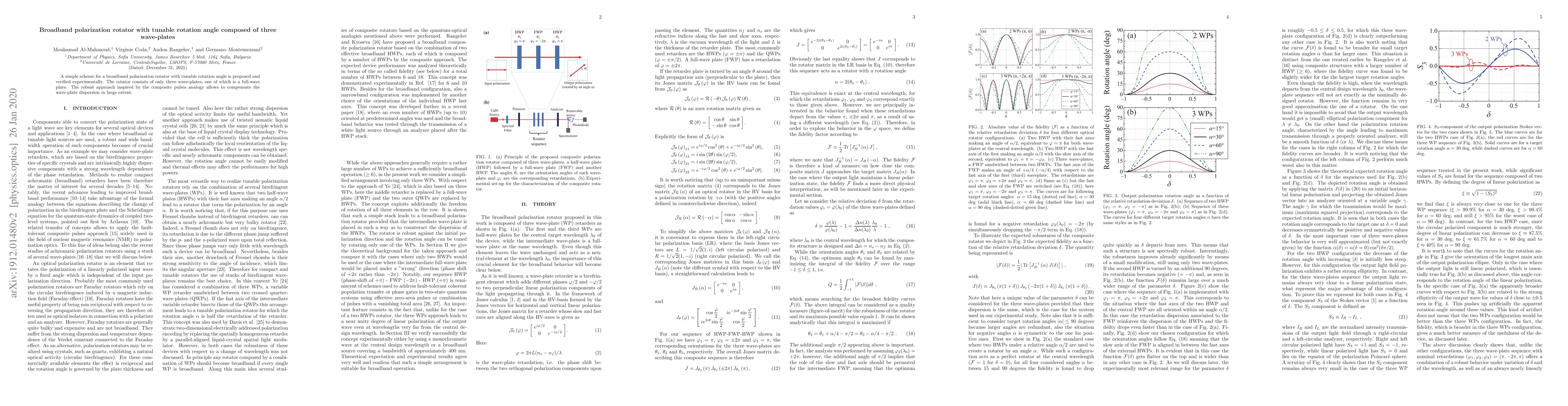 Summary: This paper proposes and verifies a broadband polarization rotator using three wave-plates, including a full-wave plate, enabling tunable rotation angle. The design leverages composite pulses analogy to effectively compensate for wave-plate dispersion.