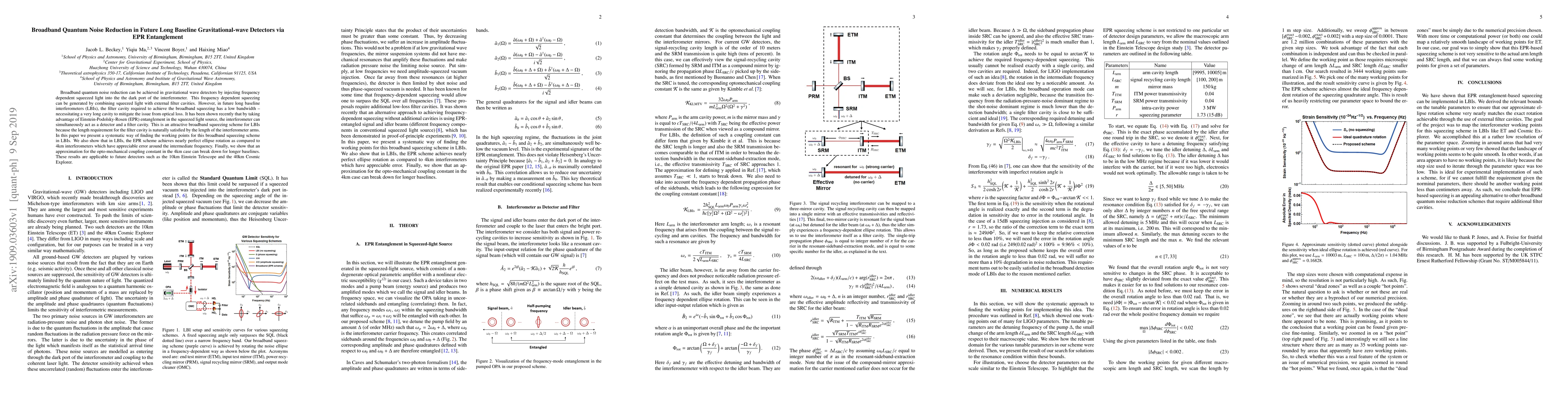 This paper presents a method for broadband quantum noise reduction in future long baseline gravitational-wave detectors using EPR entanglement in squeezed light sources. It demonstrates that the interferometer arms can act as filter cavities, reducing the need for long filter cavities and achieving nearly perfect ellipse rotation compared to shorter baselines.