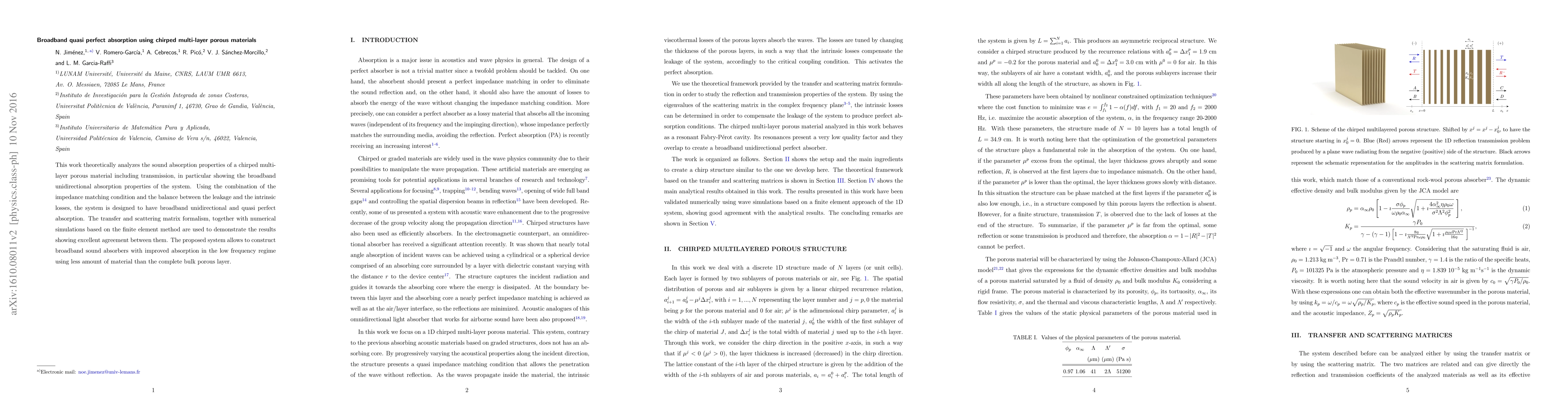 This paper explores chirped multi-layer porous materials for broadband quasi-perfect sound absorption, achieving unidirectional absorption through impedance matching and loss balance. Numerical simulations confirm the design's effectiveness in creating efficient low-frequency sound absorbers with reduced material usage.