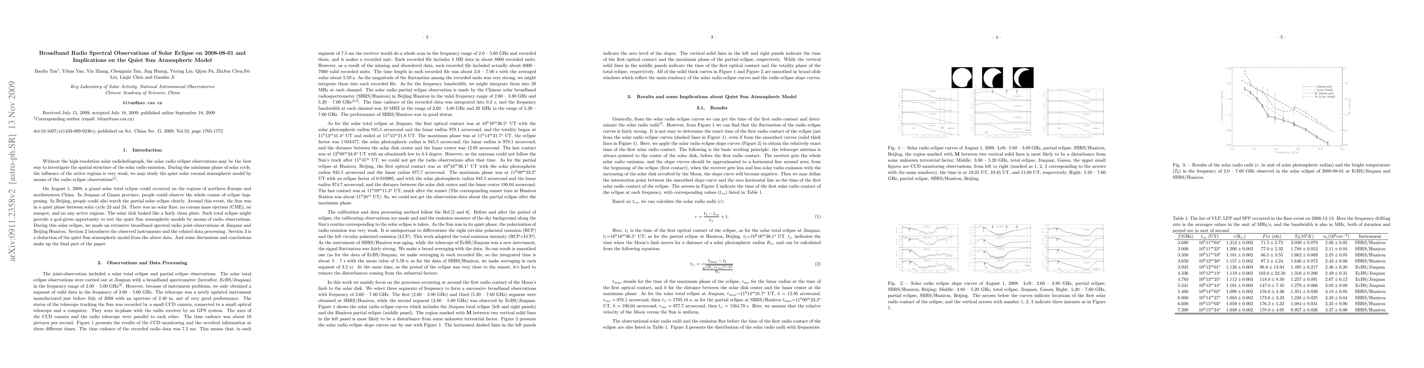 Based on the joint-observations of the radio broadband spectral emissions of solar eclipse on August 1, 2008 at Jiuquan (total eclipse) and Huairou (partial eclipse) at the frequencies of 2.00 -- 5.60 GHz (Jiuquan), 2.60 -- 3.80 GHZ (Chinese solar broadband radiospectrometer, SBRS/Huairou), and 5.20 -- 7.60 GHz (SBRS/Huairou), the authors assemble a successive series of broadband spectrum with a frequency of 2.60 -- 7.60 GHz to observe the solar eclipse synchronously. This is the first attempt to analyze the solar eclipse radio emission under the two telescopes located at different places with broadband frequencies in the periods of total and partial eclipse. With these analyses, the authors made a new semiempirical model of the coronal plasma density of the quiet Sun and made a comparison with the classic models.