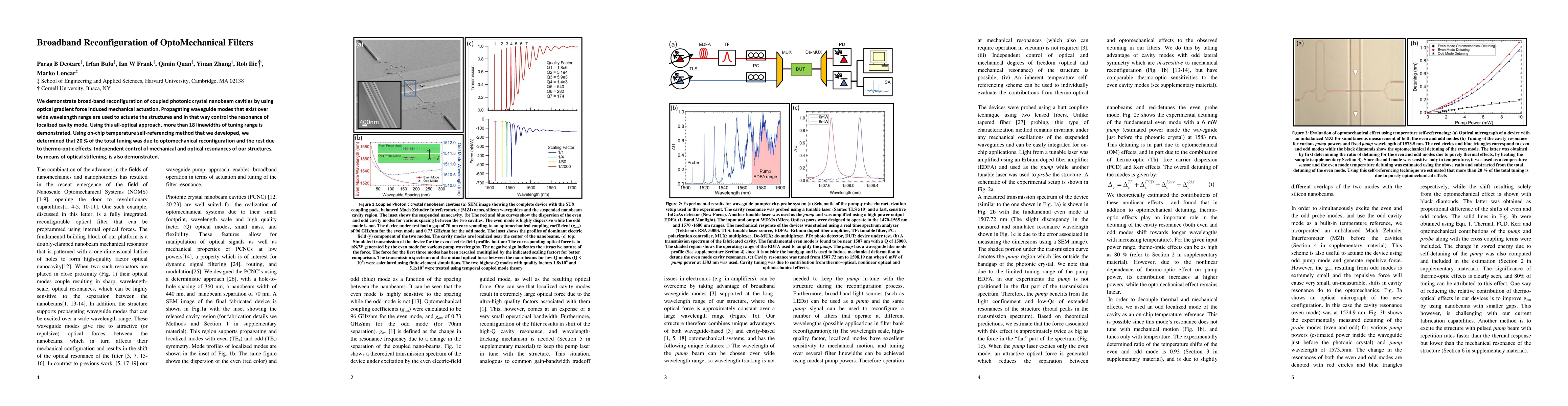 We demonstrate broad-band reconfiguration of coupled photonic crystal nanobeam cavities by using optical gradient force induced mechanical actuation. Propagating waveguide modes that exist over wide wavelength range are used to actuate the structures and in that way control the resonance of localized cavity mode. Using this all-optical approach, more than 18 linewidths of tuning range is demonstrated. Using on-chip temperature self-referencing method that we developed, we determined that 20 % of the total tuning was due to optomechanical reconfiguration and the rest due to thermo-optic effects. Independent control of mechanical and optical resonances of our structures, by means of optical stiffening, is also demonstrated.