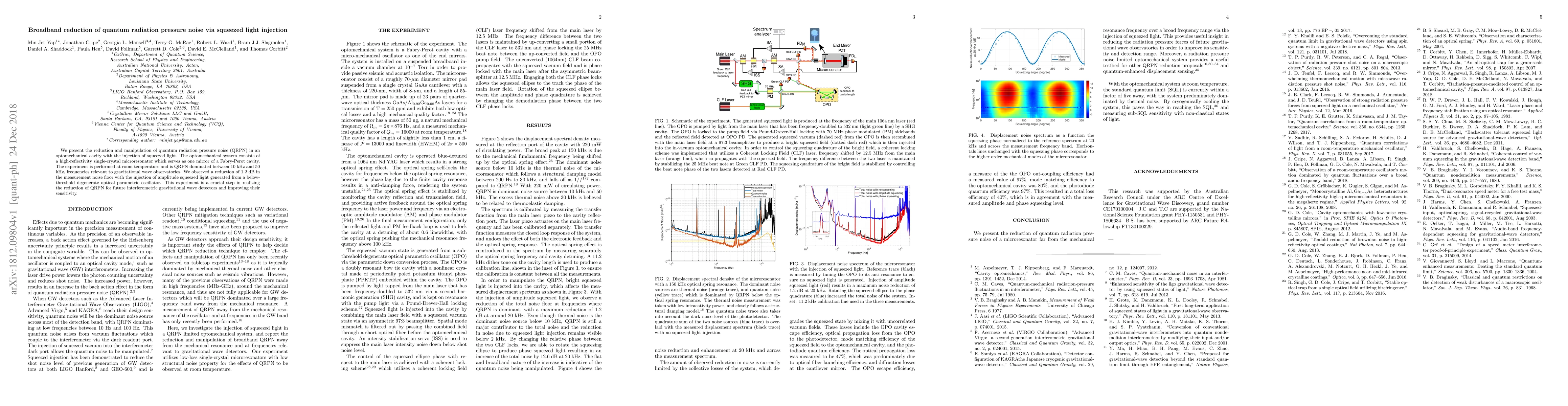 This research demonstrates the reduction of quantum radiation pressure noise (QRPN) in an optomechanical cavity using squeezed light, achieving a 1.2 dB noise floor reduction at room temperature. The method holds promise for enhancing the sensitivity of future interferometric gravitational wave detectors.