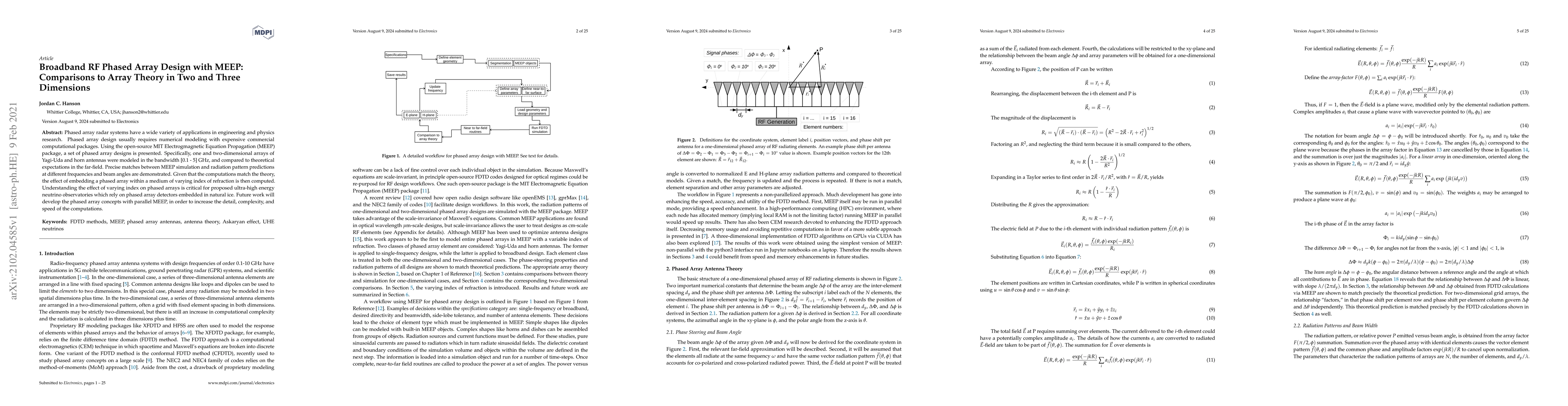 This paper presents phased array designs using the open-source MEEP package, comparing simulations to theoretical predictions for Yagi-Uda and horn antennas in 1D and 2D configurations. The study also investigates the impact of varying index of refraction on phased arrays, relevant for neutrino observatories.