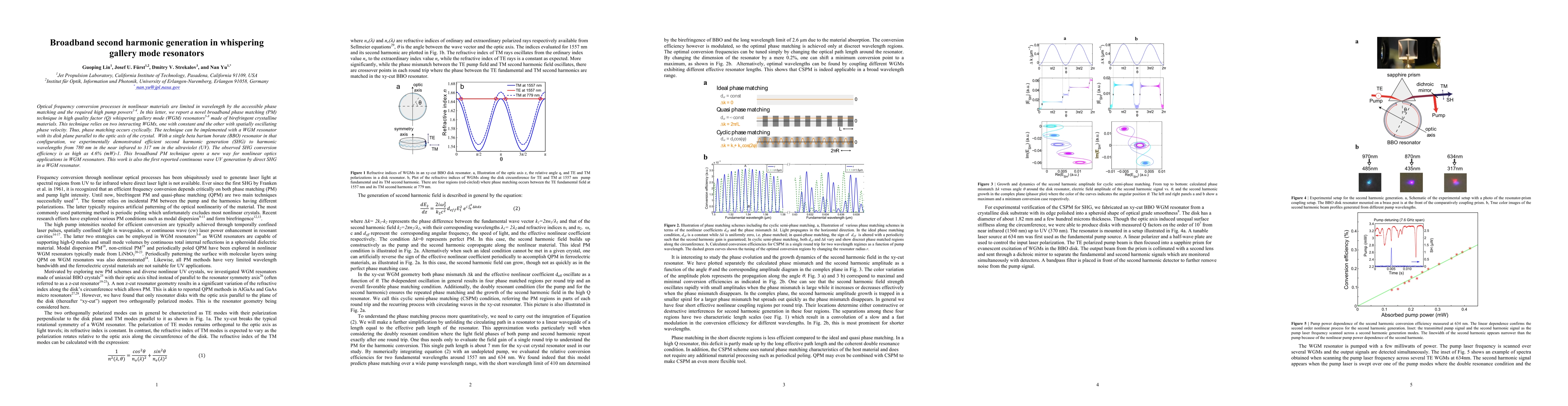 This paper presents a novel broadband phase matching technique in high Q whispering gallery mode resonators, enabling efficient second harmonic generation from near infrared to ultraviolet wavelengths. The method uses two interacting WGMs, demonstrating conversion efficiency up to 4.6% (mW)-1 in a beta barium borate resonator.