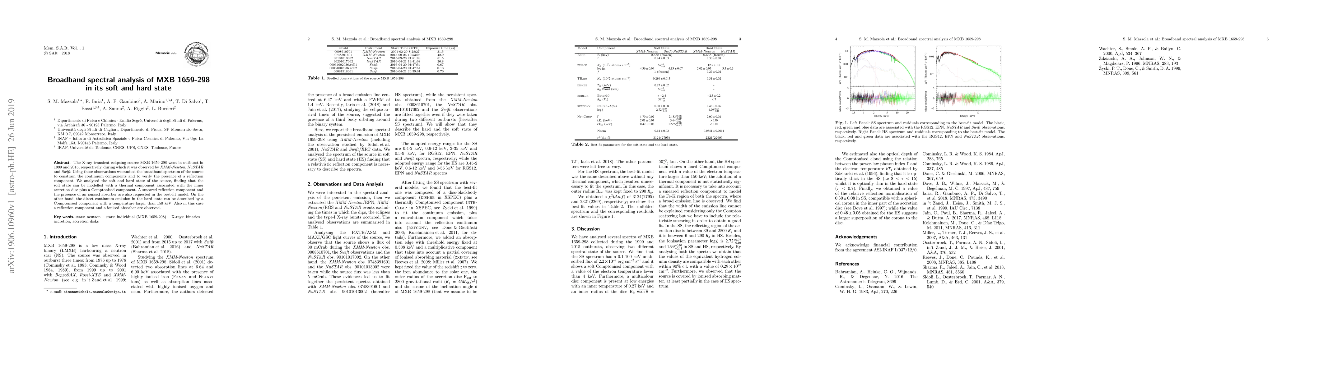 The X-ray transient eclipsing source MXB 1659-298 went in outburst in 1999 and 2015, respectively, during which it was observed by XMM-Newton, NuSTAR and Swift. Using these observations we studied the broadband spectrum of the source to constrain the continuum components and to verify the presence of a reflection component. We analysed the soft and hard state of the source, finding that the soft state can be modelled with a thermal component associated with the inner accretion disc plus a Comptonised component. A smeared reflection component and the presence of an ionised absorber are also requested in the best-fit model. On the other hand, the direct continuum emission in the hard state can be described by a Comptonised component with a temperature larger than 150 keV. Also in this case a reflection component and a ionised absorber are observed.