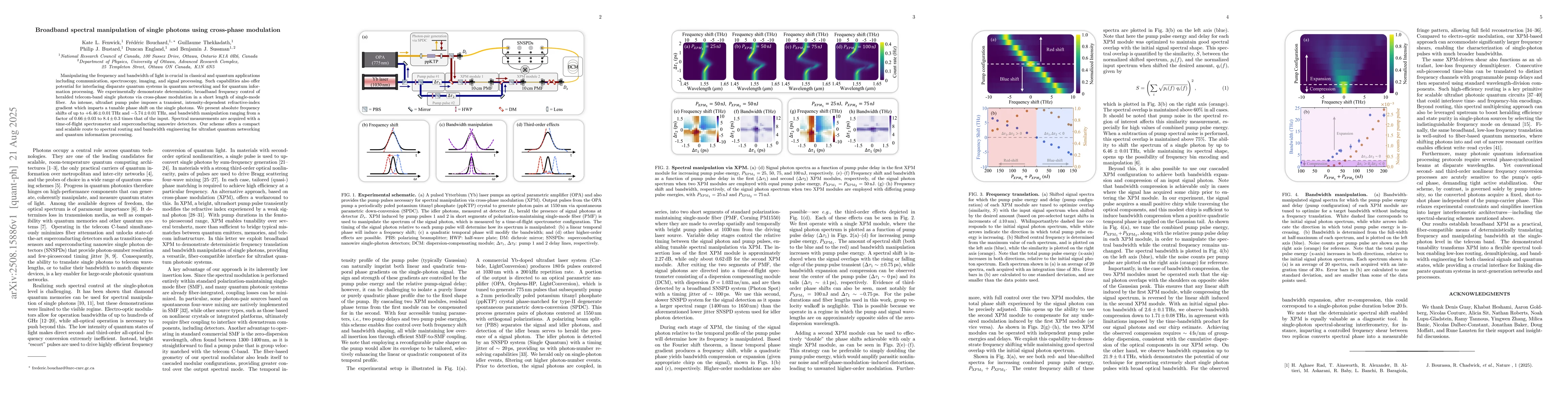Manipulating the frequency and bandwidth of light is crucial in classical and quantum applications including communication, spectroscopy, imaging, and signal processing. Such capabilities also offer potential for interfacing disparate quantum systems in quantum networking and for quantum information processing. We experimentally demonstrate deterministic, broadband frequency control of heralded telecom-band single photons via cross-phase modulation in a short length of single-mode fiber. An intense, ultrafast pump pulse imposes a transient, intensity-dependent refractive-index gradient which imparts a tunable phase shift on the single photons. We present absolute frequency shifts of up to $+6.46\pm0.01$\,THz and $-5.74\pm0.01$\,THz, and bandwidth manipulation ranging from a factor of $0.66\pm0.03$ to $8.4\pm0.3$ times that of the input. Spectral measurements are acquired with a time-of-flight spectrometer and superconducting nanowire detectors. Our scheme offers a compact and scalable route to spectral routing and bandwidth engineering for ultrafast quantum networking and quantum information processing.