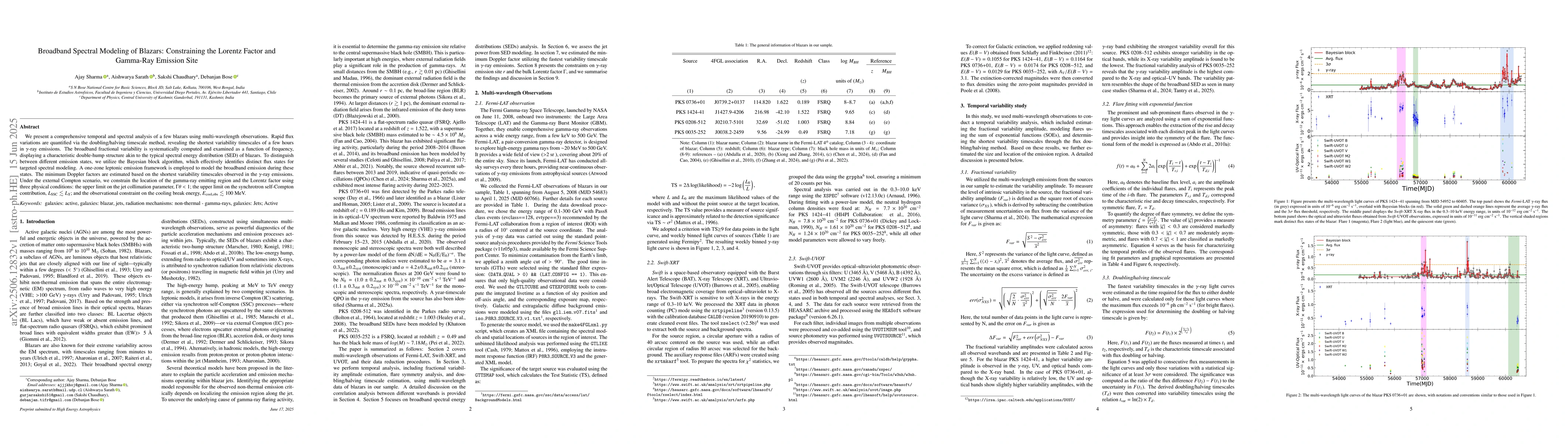 We present a comprehensive temporal and spectral analysis of a few blazars using multi-wavelength observations. Rapid flux variations are quantified via the doubling/halving timescale method, revealing the shortest variability timescales of a few hours in $\gamma$-ray emissions. The broadband fractional variability is systematically computed and examined as a function of frequency, displaying a characteristic double-hump structure akin to the typical spectral energy distribution (SED) of blazars. To distinguish between different emission states, we utilize the Bayesian block algorithm, which effectively identifies distinct flux states for targeted spectral modeling. A one-zone leptonic emission framework is employed to model the broadband emission during these states. The minimum Doppler factors are estimated based on the shortest variability timescales observed in the $\gamma$-ray emissions. Under the external Compton scenario, we constrain the location of the gamma-ray emitting region and the Lorentz factor using three physical conditions: the upper limit on the jet collimation parameter, $\Gamma \theta < 1$; the upper limit on the synchrotron self-Compton contribution, $L_{\mathrm{SSC}} \lesssim L_X$; and the observational constraint on the cooling break energy, $E_{\mathrm{cool, obs}} \lesssim 100$ MeV.