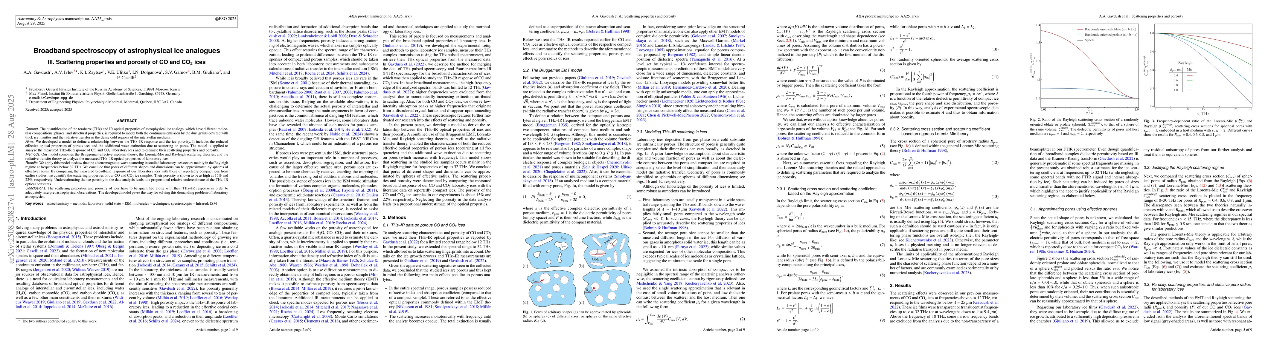 $Context.$ The quantification of the terahertz (THz) and IR optical properties of astrophysical ice analogs, which have different molecular compositions, phases, and structural properties, is required to model both the continuum emission by the dust grains covered with thick icy mantles and the radiative transfer in the dense cold regions of the interstellar medium. $Aims.$ We developed a model to define a relationship between the THz$-$IR response and the ice porosity. It includes the reduced effective optical properties of porous ices and the additional wave extinction due to scattering on pores. The model is applied to analyze the measured THz$-$IR response of CO and CO$_2$ laboratory ices and to estimate their scattering properties and porosity. $Methods.$ Our model combines the Bruggeman effective medium theory, the Lorentz-Mie and Rayleigh scattering theories, and the radiative transfer theory to analyze the measured THz$-$IR optical properties of laboratory ices. $Results.$ We apply this model to show that the electromagnetic-wave scattering in studied laboratory ices occurs mainly in the Rayleigh regime at frequencies below 32 THz. We conclude that pores of different shapes and dimensions can be approximated by spheres of effective radius. By comparing the measured broadband response of our laboratory ices with those of reportedly compact ices from earlier studies, we quantify the scattering properties of our CO and CO$_2$ ice samples. Their porosity is shown to be as high as 15% and 22%, respectively. Underestimating the ice porosity in the data analysis leads to a proportional relative underestimate of the THz$-$IR optical constants. $Conclusions.$ The scattering properties and porosity of ices have to be quantified along with their THz$-$IR response in order to adequately interpret astrophysical observations.