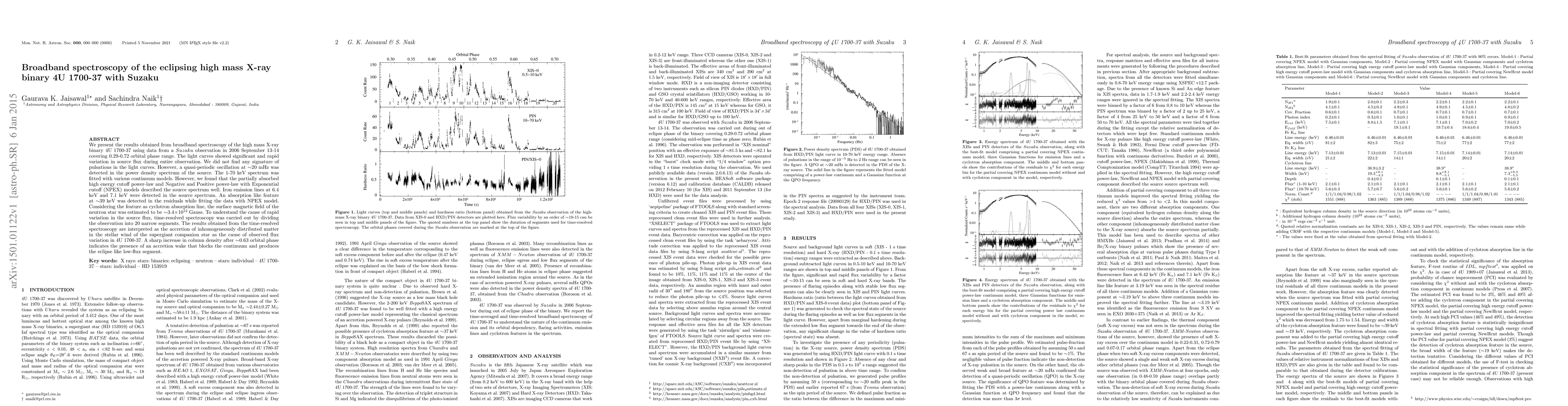 We present the results obtained from broadband spectroscopy of the high mass X-ray binary 4U 1700-37 using data from a Suzaku observation in 2006 September 13-14 covering 0.29-0.72 orbital phase range. The light curves showed significant and rapid variation in source flux during entire observation. We did not find any signature of pulsations in the light curves. However, a quasi-periodic oscillation at ~20 mHz was detected in the power density spectrum of the source. The 1-70 keV spectrum was fitted with various continuum models. However, we found that the partially absorbed high energy cutoff power-law and Negative and Positive power-law with Exponential cutoff (NPEX) models described the source spectrum well. Iron emission lines at 6.4 keV and 7.1 keV were detected in the source spectrum. An absorption like feature at ~39 keV was detected in the residuals while fitting the data with NPEX model. Considering the feature as cyclotron absorption line, the surface magnetic field of the neutron star was estimated to be ~3.4 times 10^12 Gauss. To understand the cause of rapid variation in the source flux, time-resolved spectroscopy was carried out by dividing the observation into 20 narrow segments. The results obtained from the time-resolved spectroscopy are interpreted as the accretion of inhomogeneously distributed matter in the stellar wind of the supergiant companion star as the cause of observed flux variation in 4U 1700-37. A sharp increase in column density after ~0.63 orbital phase indicates the presence of an accretion wake that blocks the continuum and produces the eclipse like low-flux segment.