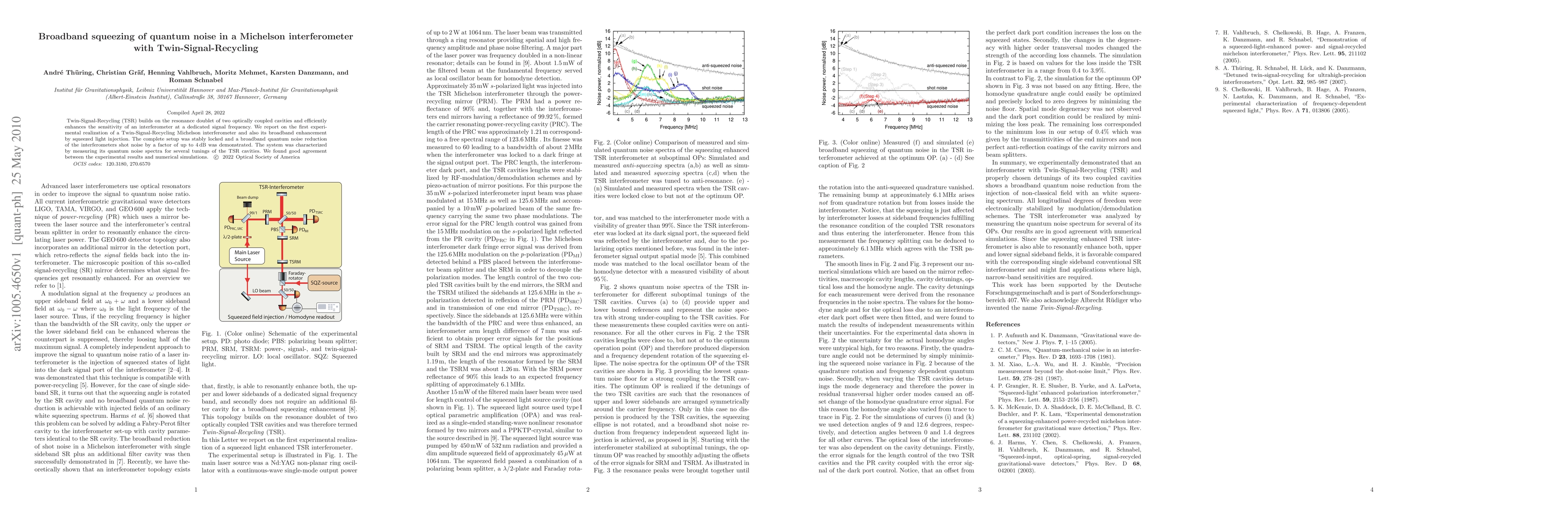 This paper reports the first experimental realization of a Twin-Signal-Recycling Michelson interferometer, achieving broadband quantum noise reduction by up to 4 dB through squeezed light injection. The system's performance was validated by comparing experimental quantum noise spectra with numerical simulations.