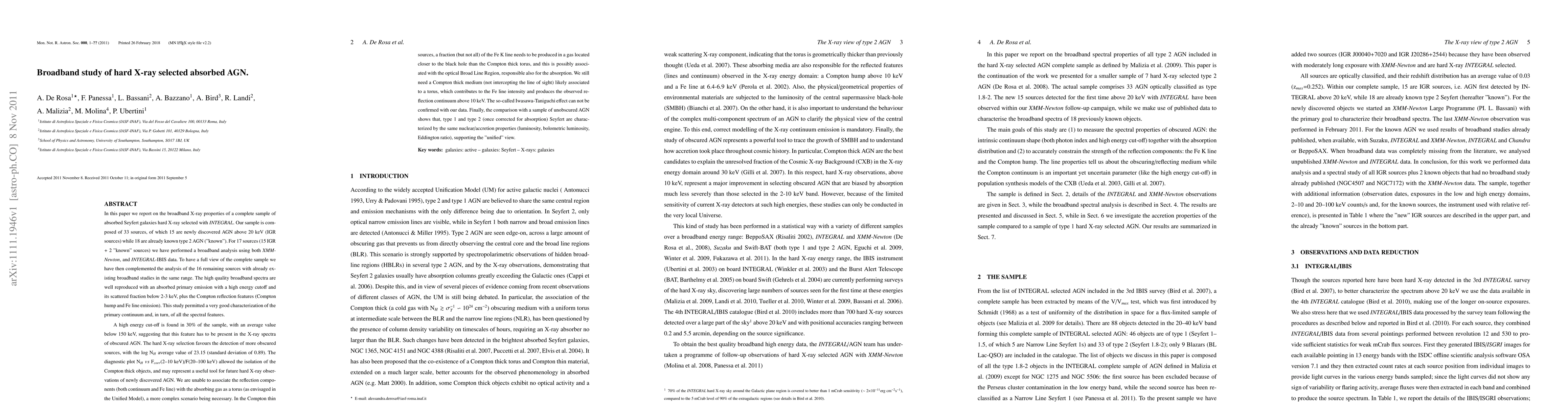 [Abridged]We report on the broadband X-ray properties of a complete sample of absorbed Seyfert galaxies hard X-ray selected with INTEGRAL. The sample is composed of 33 sources: 15 are newly discovered above 20 keV while 18 are already known AGN. For 17 sources we have performed a broadband analysis with XMM and INTEGRAL data. We have complemented the analysis of the 16 remaining sources with existing broadband studies. The spectra are well reproduced with an absorbed primary emission with a high energy cutoff and its scattered fraction below 2-3 keV, plus the Compton reflection features. A high energy cut-off is found in 30% of the sample, with an average value below 150 keV. The hard X-ray selection favours the detection of more obscured sources, with the log NH average value of 23.15. The diagnostic plot NH vs F(corr)(2-10keV)/F(20-100keV) allowed the isolation of the Compton thick objects and may represent a useful tool for future hard X-ray observations of newly discovered AGN. We are unable to associate the reflection components (continuum and Fe line) with the absorbing gas as a torus, a more complex scenario being necessary. In the Compton thin sources, a fraction (but not all) of the Fe line needs to be produced in a gas located closer to the BH than the thick torus, and this is possibly associated with the optical BLR, responsible also for the absorption. We still need a Compton thick medium (not intercepting the line of sight) likely associated to a torus, which contributes to the Fe line and produces the observed reflection continuum above 10 keV. The Iwasawa-Taniguchi effect can not be confirmed with our data. Finally, the comparison with a sample of unobscured AGN shows that, type 1 and type 2 (once corrected for absorption) Seyfert are characterized by the same nuclear/accretion properties (luminosity, bolometric luminosity, Eddington ratio), supporting the unified view.