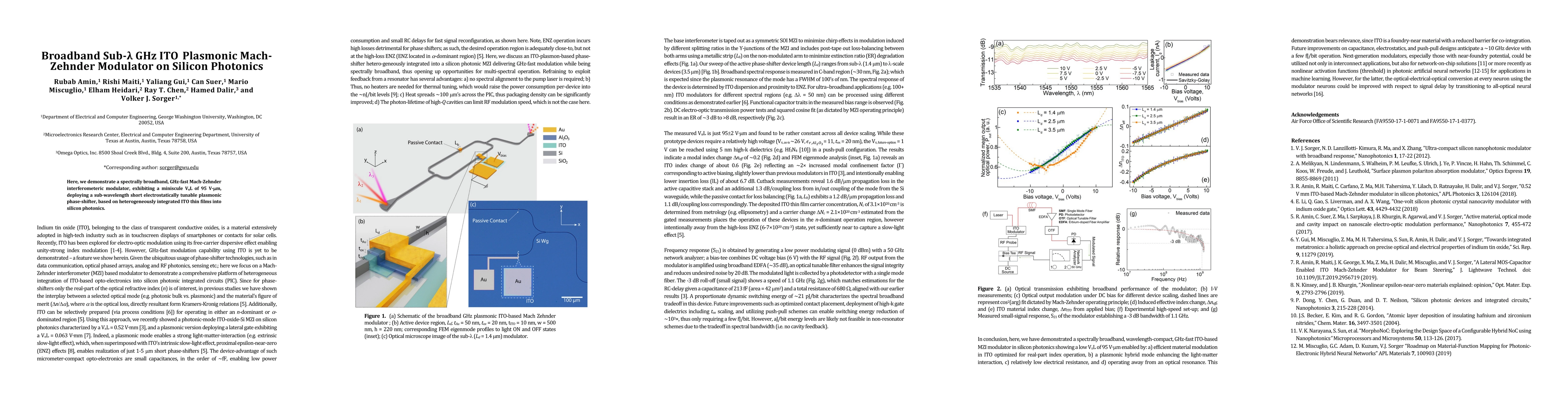 This work is novel due to its broadband, wavelength-compact, and GHz-fast ITO-based MZI modulator in silicon photonics, showcasing a low VπL enabled by optimized material modulation, plasmonic hybrid mode, low electrical resistance, and operation away from optical resonance. The research also highlights the potential of ITO as a foundry-near material for co-integration in various photonic applications.