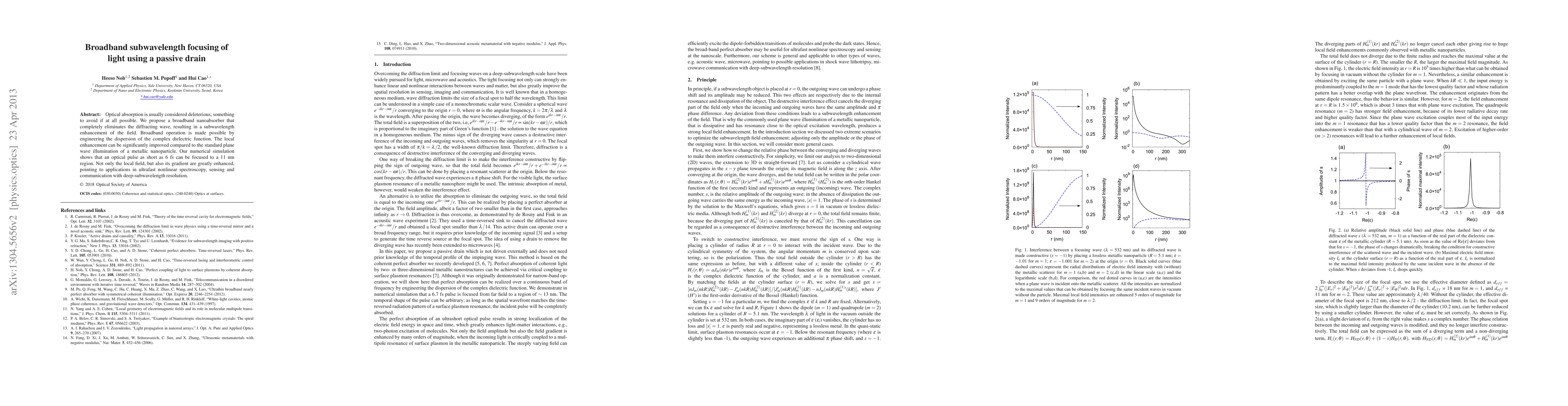 Optical absorption is usually considered deleterious, something to avoid if at all possible. We propose a broadband nanoabsorber that completely eliminates the diffracting wave, resulting in a subwavelength enhancement of the field. Broadband operation is made possible by engineering the dispersion of the complex dielectric function. The local enhancement can be significantly improved compared to the standard plane wave illumination of a metallic nanoparticle. Our numerical simulation shows that an optical pulse as short as 6 fs can be focused to a 11 nm region. Not only the local field, but also its gradient are greatly enhanced, pointing to applications in ultrafast nonlinear spectroscopy, sensing and communication with deep-subwavelength resolution.