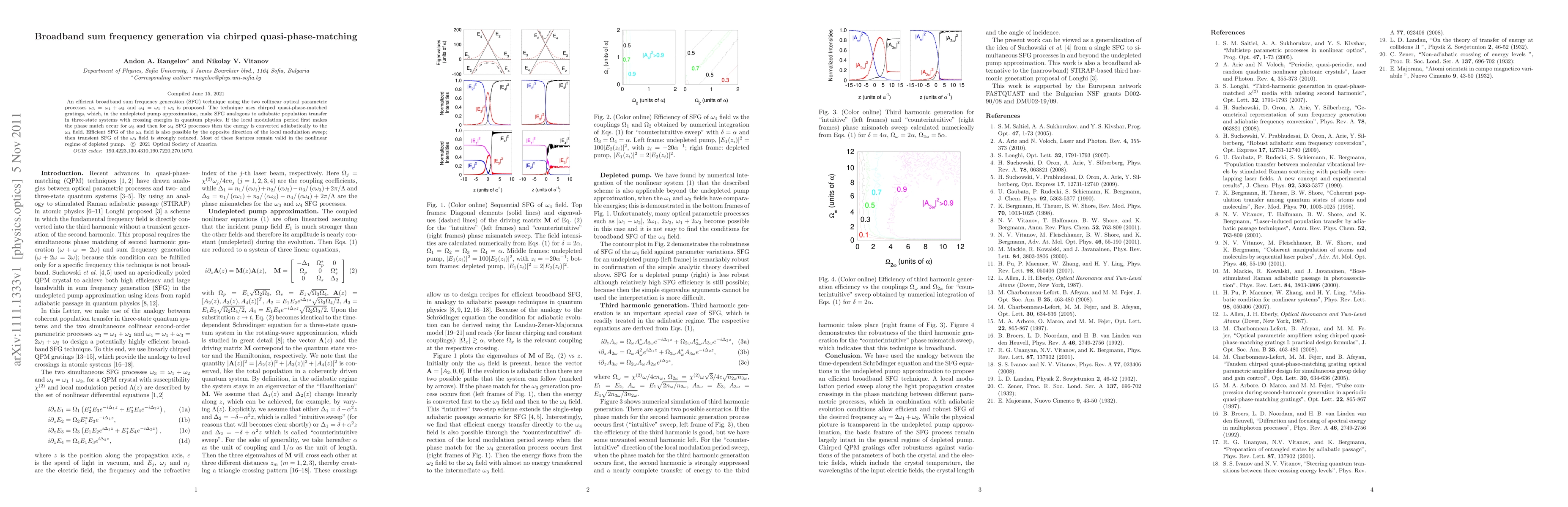 This paper proposes an efficient broadband sum frequency generation technique using chirped quasi-phase-matching gratings, which enable adiabatic population transfer analogous to quantum physics. The method allows for efficient conversion of energy into higher frequency fields while minimizing transient sum frequency generation.
