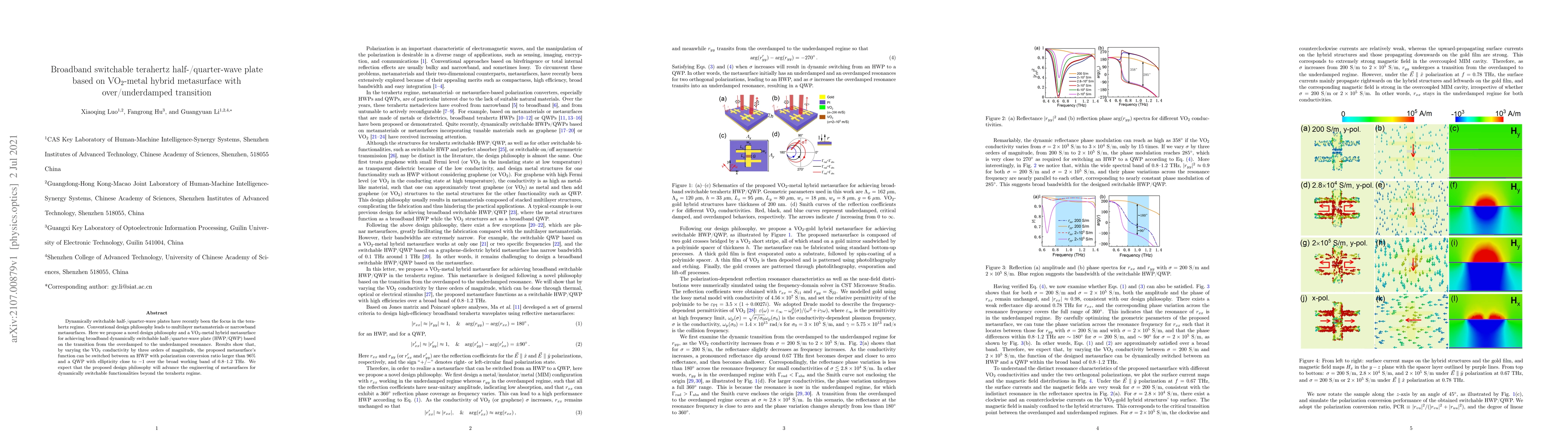 The research introduces a novel VO2-metal hybrid metasurface for broadband dynamically switchable terahertz half- and quarter-wave plates, transitioning from overdamped to underdamped resonance. The metasurface achieves switchable functionalities with high polarization conversion efficiency over a broad 0.8-1.2 THz band.