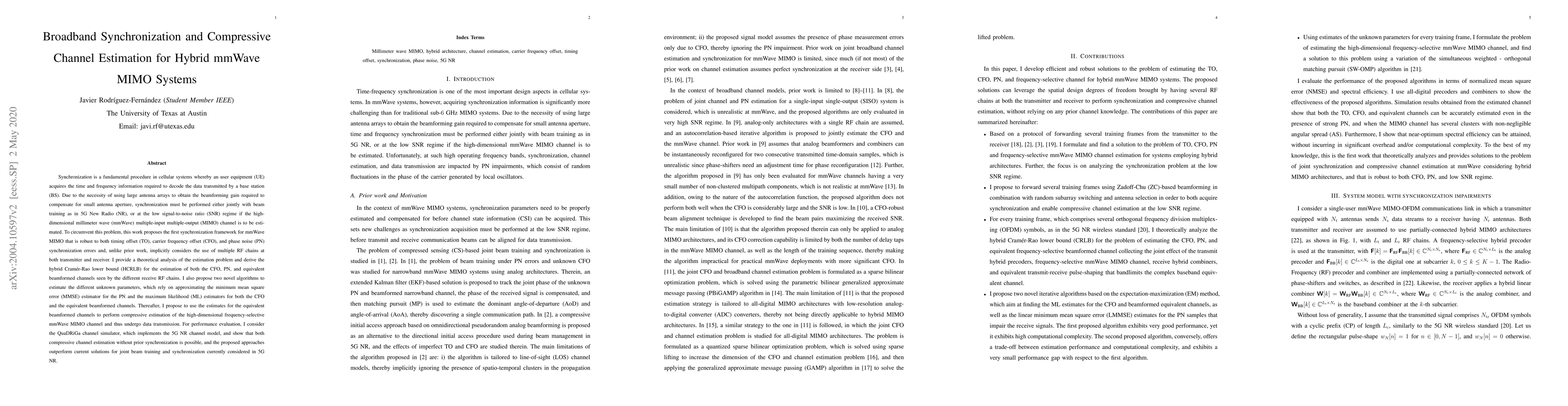 Synchronization is a fundamental procedure in cellular systems whereby an UE acquires the time and frequency information required to decode the data transmitted by a BS. Due to the necessity of using large antenna arrays to obtain the beamforming gain required to compensate for small antenna aperture, synchronization must be performed either jointly with beam training as in 5G NR, or at the low SNR regime if the high-dimensional mmWave MIMO channel is to be estimated. To circumvent this problem, this work proposes the first synchronization framework for mmWave MIMO that is robust to both TO, CFO, and PN synchronization errors and, unlike prior work, implicitly considers the use of multiple RF chains at both transmitter and receiver. I provide a theoretical analysis of the estimation problem and derive the HCRLB for the estimation of both the CFO, PN, and equivalent beamformed channels seen by the different receive RF chains. I also propose two novel algorithms to estimate the different unknown parameters, which rely on approximating the MMSE estimator for the PN and the ML estimators for both the CFO and the equivalent beamformed channels. Thereafter, I propose to use the estimates for the equivalent beamformed channels to perform compressive estimation of the high-dimensional frequency-selective mmWave MIMO channel and thus undergo data transmission. For performance evaluation, I consider the QuaDRiGa channel simulator, which implements the 5G NR channel model, and show that both compressive channel estimation without prior synchronization is possible, and the proposed approaches outperform current solutions for joint beam training and synchronization currently considered in 5G NR.