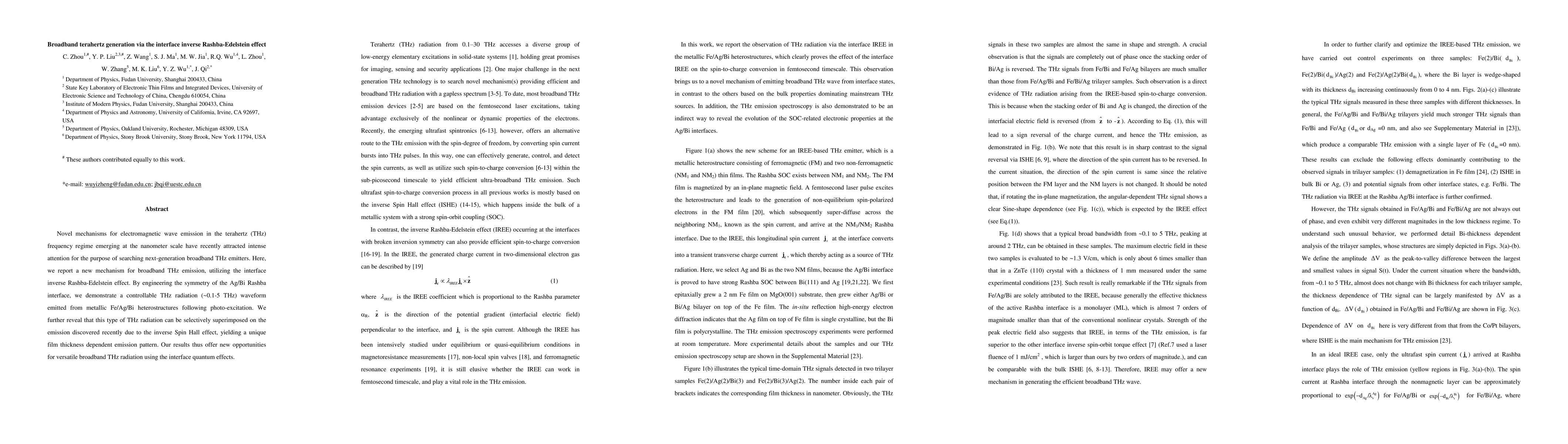 This paper reports a novel mechanism for broadband terahertz (THz) emission via the interface inverse Rashba-Edelstein effect, demonstrating controllable THz radiation (~0.1-5 THz) in metallic Fe/Ag/Bi heterostructures. The study also reveals a unique film thickness dependent emission pattern when combined with inverse Spin Hall effect-induced THz radiation.