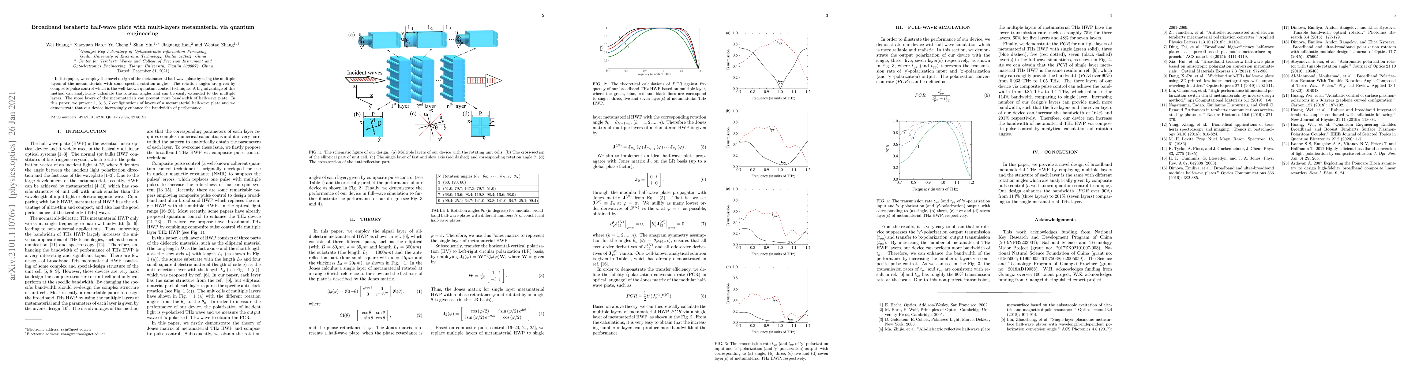 This paper introduces a broadband terahertz half-wave plate using multi-layer metamaterials controlled by composite pulse techniques, demonstrating enhanced bandwidth through configurations of 1, 3, 5, and 7 layers. The design leverages quantum engineering for precise angle calculations, extending to multiple layers.
