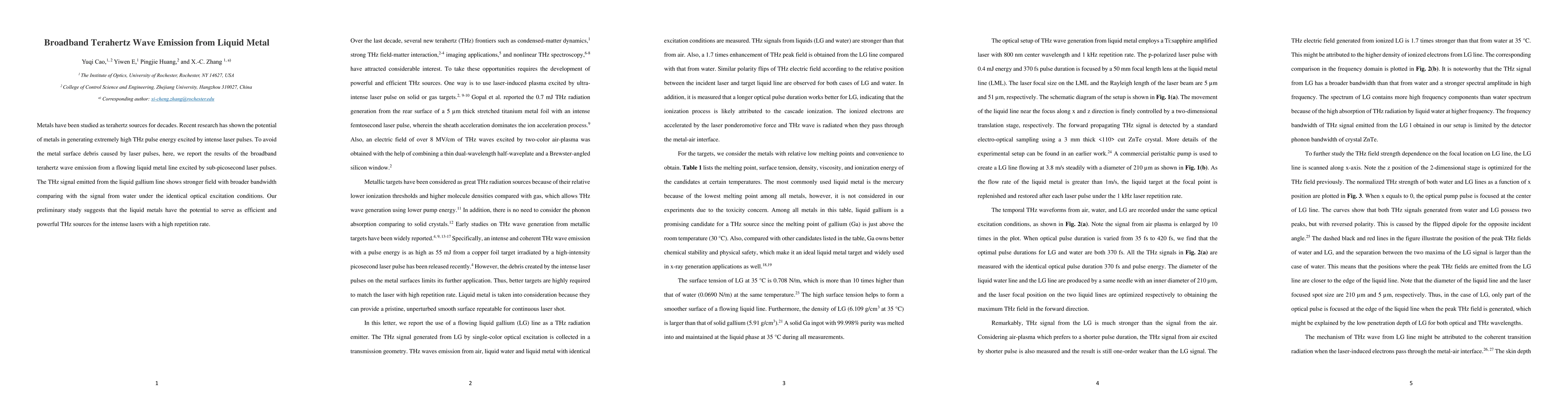 This paper investigates the generation of broadband terahertz waves from a flowing liquid metal line excited by sub-picosecond laser pulses, demonstrating stronger and broader bandwidth signals compared to water under identical conditions. The findings suggest liquid metals could serve as efficient and powerful terahertz sources for high-repetition-rate intense lasers.