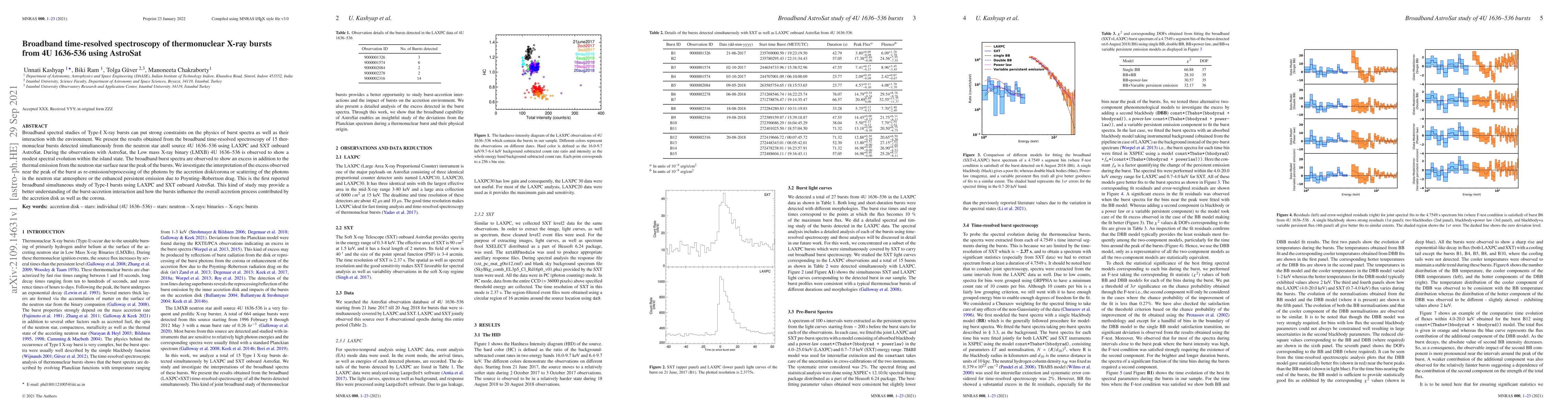 This study uses AstroSat's LAXPC and SXT to perform broadband time-resolved spectroscopy on 15 thermonuclear X-ray bursts from 4U 1636-536, revealing spectral evolution and an excess emission near burst peaks. The paper explores potential causes for this excess, including reprocessing by the accretion disk/corona, scattering effects, or enhanced persistent emission, aiming to better understand burst-accretion interactions.