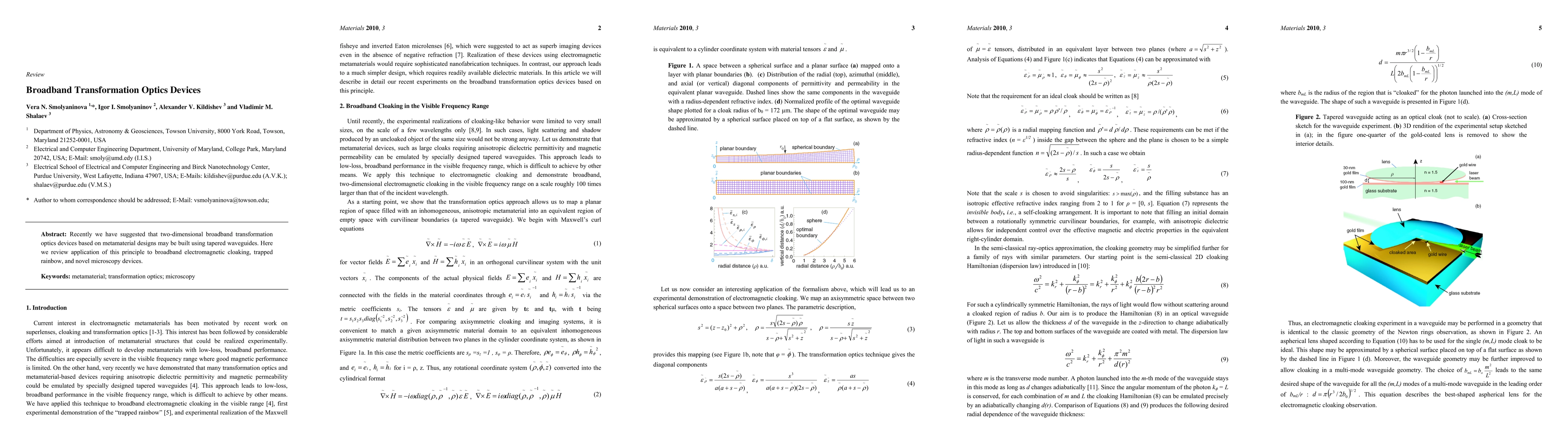 Summary: This paper reviews the application of two-dimensional broadband transformation optics devices based on metamaterial designs, specifically focusing on their use in electromagnetic cloaking, trapped rainbow effects, and innovative microscopy techniques using tapered waveguides.