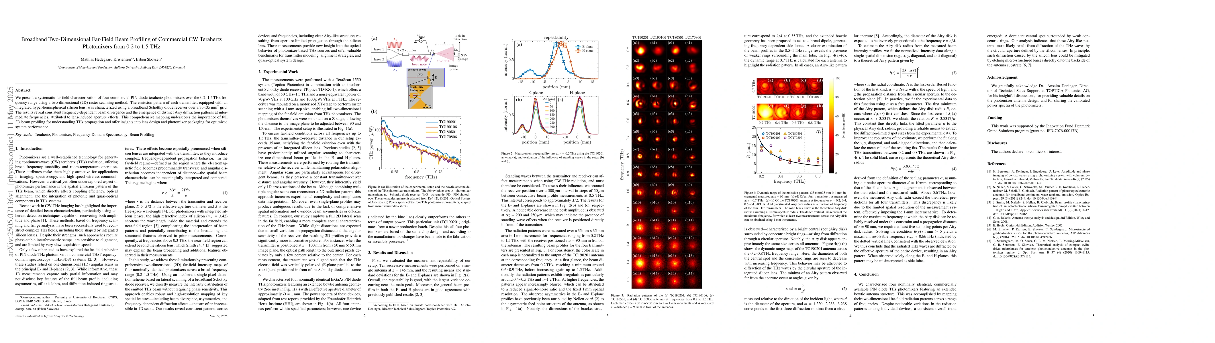 The paper presents a detailed 2D far-field beam profiling technique for commercial terahertz photomixers, revealing frequency-dependent beam divergence and lens-induced diffraction patterns.