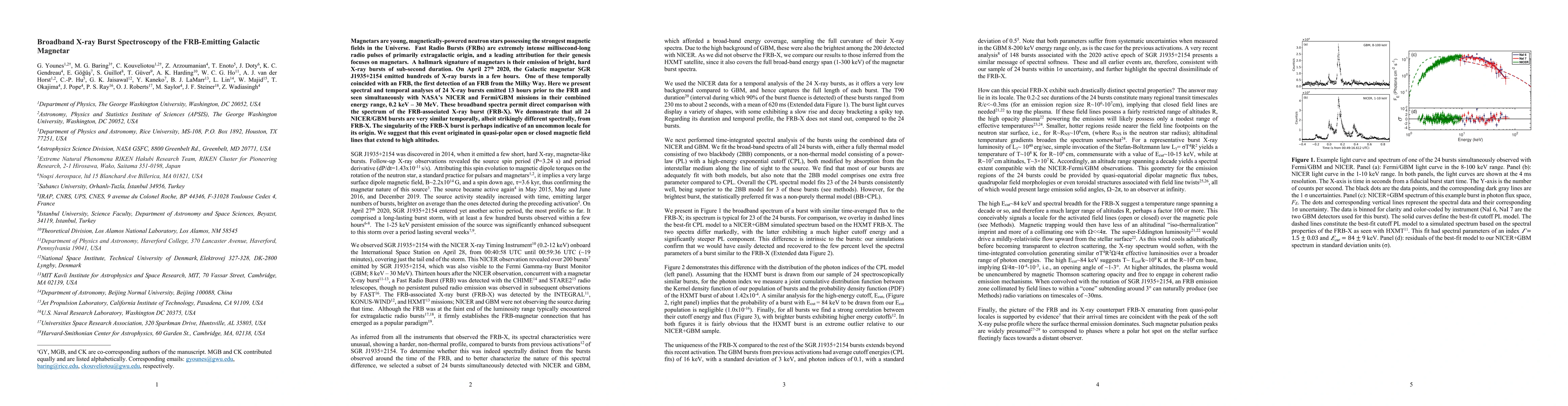 Magnetars are young, magnetically-powered neutron stars possessing the strongest magnetic fields in the Universe. Fast Radio Bursts (FRBs) are extremely intense millisecond-long radio pulses of primarily extragalactic origin, and a leading attribution for their genesis focuses on magnetars. A hallmark signature of magnetars is their emission of bright, hard X-ray bursts of sub-second duration. On April 27th 2020, the Galactic magnetar SGR J1935+2154 emitted hundreds of X-ray bursts in a few hours. One of these temporally coincided with an FRB, the first detection of an FRB from the Milky Way. Here we present spectral and temporal analyses of 24 X-ray bursts emitted 13 hours prior to the FRB and seen simultaneously with the NASA NICER and Fermi/GBM missions in their combined energy range, 0.2 keV-30 MeV. These broadband spectra permit direct comparison with the spectrum of the FRB-associated X-ray burst (FRB-X). We demonstrate that all 24 NICER/GBM bursts are very similar temporally, albeit strikingly different spectrally, from FRB-X. The singularity of the FRB-X burst is perhaps indicative of an uncommon locale for its origin. We suggest that this event originated in quasi-polar open or closed magnetic field lines that extend to high altitudes.