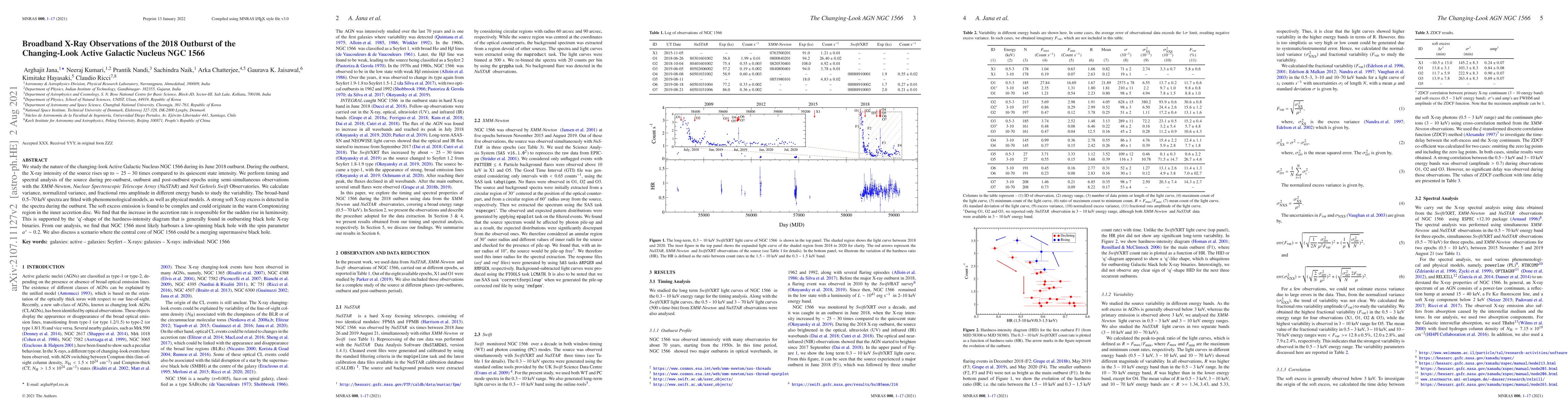 We study the nature of the changing-look Active Galactic Nucleus NGC 1566 during its June 2018 outburst. During the outburst, the X-ray intensity of the source rises up to ~25-30 times compared to its quiescent state intensity. We perform timing and spectral analysis of the source during pre-outburst, outburst, and post-outburst epochs using semi-simultaneous observations with the XMM-Newton, Nuclear Spectroscopic Telescope Array (NuSTAR), and Neil Gehrels Swift Observatories. We calculate variance, normalized variance, and fractional rms amplitude in different energy bands to study the variability. The broad-band 0.5-70 keV spectra are fitted with phenomenological models, as well as physical models. A strong soft X-ray excess is detected in the spectra during the outburst. The soft excess emission is found to be complex and could originate in the warm Comptonizing region in the inner accretion disc. We find that the increase in the accretion rate is responsible for the sudden rise in luminosity. This is supported by the q-shape of the hardness-intensity diagram that is generally found in outbursting black hole X-ray binaries. From our analysis, we find that NGC 1566 most likely harbours a low-spinning black hole with the spin parameter a* ~ 0.2. We also discuss a scenario where the central core of NGC 1566 could be a merging supermassive black hole.