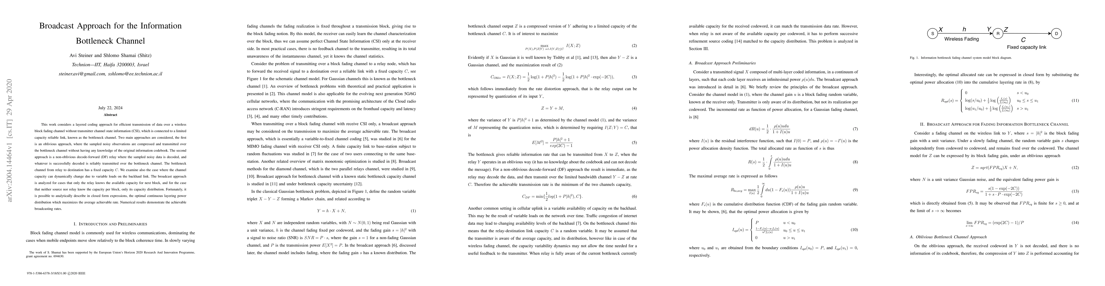 This work considers a layered coding approach for efficient transmission of data over a wireless block fading channel without transmitter channel state information (CSI), which is connected to a limited capacity reliable link, known as the bottleneck channel. Two main approaches are considered, the first is an oblivious approach, where the sampled noisy observations are compressed and transmitted over the bottleneck channel without having any knowledge of the original information codebook. The second approach is a non-oblivious decode-forward (DF) relay where the sampled noisy data is decoded, and whatever is successfully decoded is reliably transmitted over the bottleneck channel. The bottleneck channel from relay to destination has a fixed capacity C. We examine also the case where the channel capacity can dynamically change due to variable loads on the backhaul link. The broadcast approach is analyzed for cases that only the relay knows the available capacity for next block, and for the case that neither source nor relay know the capacity per block, only its capacity distribution. Fortunately, it is possible to analytically describe in closed form expressions, the optimal continuous layering power distribution which maximizes the average achievable rate. Numerical results demonstrate the achievable broadcasting rates.