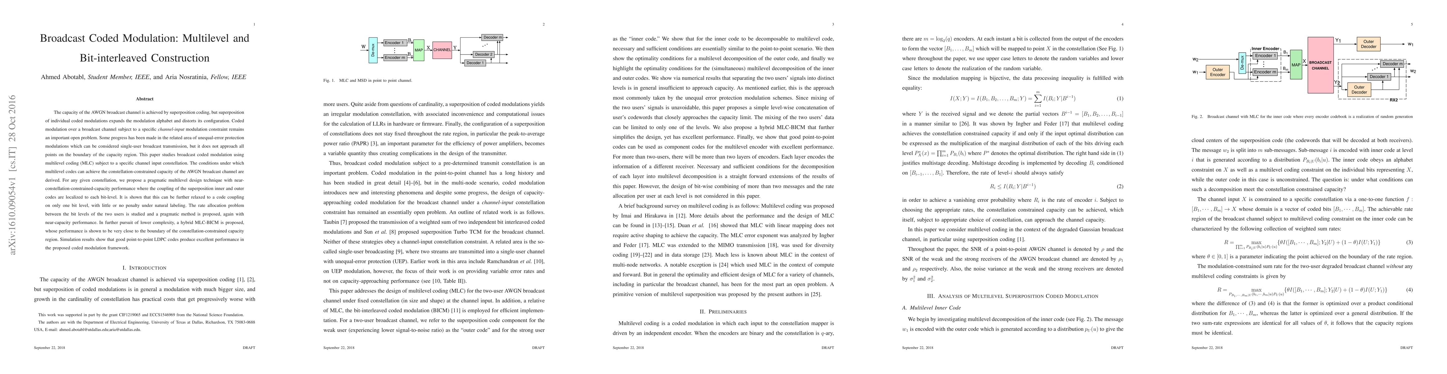 This paper investigates broadcast coded modulation using multilevel coding (MLC) under a specific channel-input modulation constraint, deriving conditions for achieving the constellation-constrained capacity of the AWGN broadcast channel. It proposes a pragmatic multilevel design technique with near-capacity performance and explores a hybrid MLC-BICM approach for lower complexity, demonstrating excellent performance with point-to-point LDPC codes.