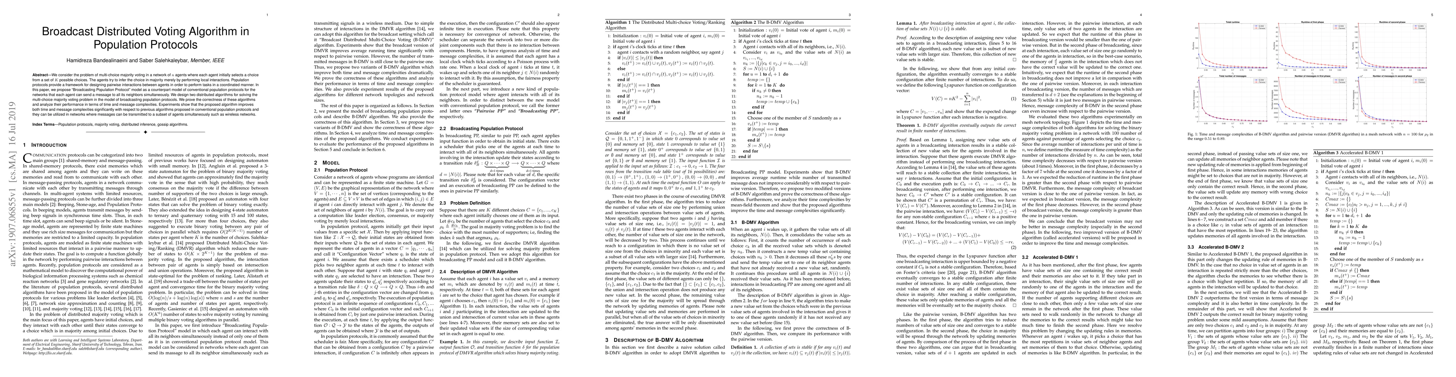 The paper proposes a Broadcast Distributed Voting Algorithm in the context of Population Protocols, where agents perform local interactions to infer the majority choice from a set of K possible choices. It introduces the Broadcasting Population Protocol model and designs two distributed algorithms for multi-choice majority voting, proving their correctness and analyzing their time and message complexities.