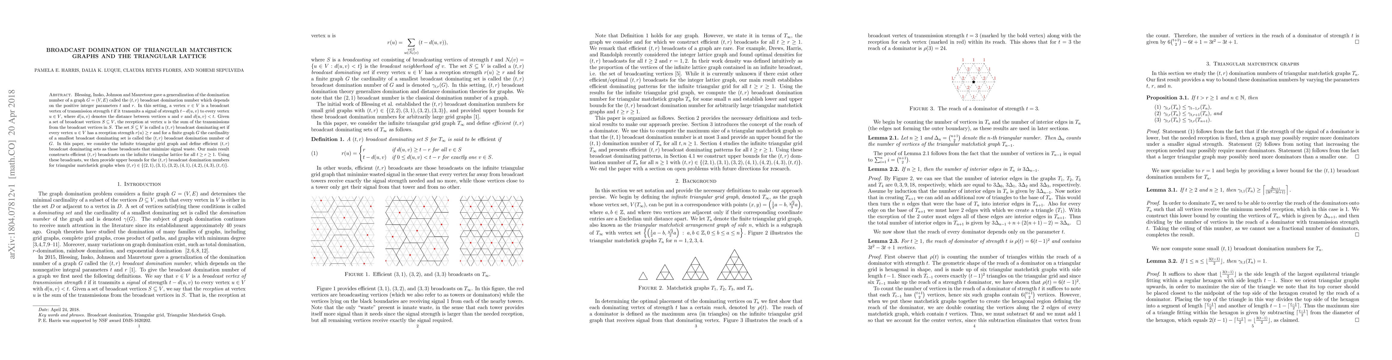 The paper constructs efficient broadcast dominating sets for the infinite triangular lattice, providing upper bounds for the domination numbers of certain triangular matchstick graphs.