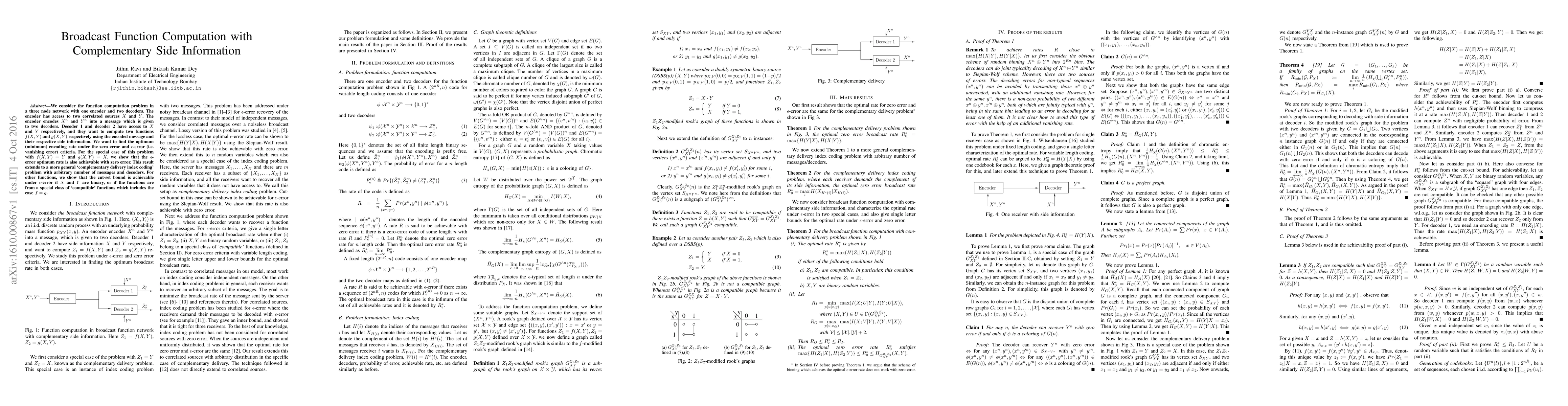We consider the function computation problem in a three node network with one encoder and two decoders. The encoder has access to two correlated sources $X$ and $Y$. The encoder encodes $X^n$ and $Y^n$ into a message which is given to two decoders. Decoder 1 and decoder 2 have access to $X$ and $Y$ respectively, and they want to compute two functions $f(X,Y)$ and $g(X,Y)$ respectively using the encoded message and their respective side information. We want to find the optimum (minimum) encoding rate under the zero error and $\epsilon$-error (i.e. vanishing error) criteria. For the special case of this problem with $f(X,Y) = Y$ and $g(X,Y) = X$, we show that the $\epsilon$-error optimum rate is also achievable with zero error. This result extends to a more general `complementary delivery index coding' problem with arbitrary number of messages and decoders. For other functions, we show that the cut-set bound is achievable under $\epsilon$-error if $X$ and $Y$ are binary, or if the functions are from a special class of `compatible' functions which includes the case $f=g$.
