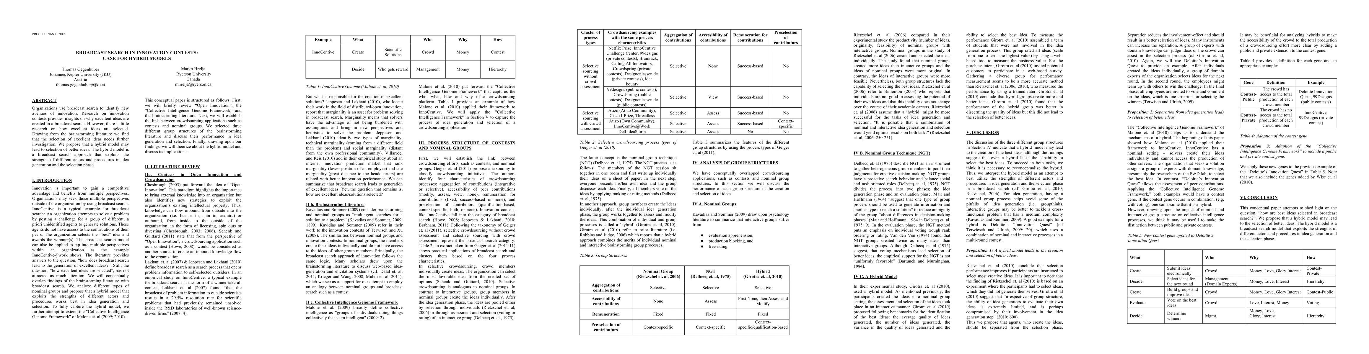 Organizations use broadcast search to identify new avenues of innovation. Research on innovation contests provides insights on why excellent ideas are created in a broadcast search. However, there is little research on how excellent ideas are selected. Drawing from the brainstorming literature we find that the selection of excellent ideas needs further investigation. We propose that a hybrid model may lead to selection of better ideas. The hybrid model is a broadcast search approach that exploits the strengths of different actors and procedures in idea generation and the selection phase.
