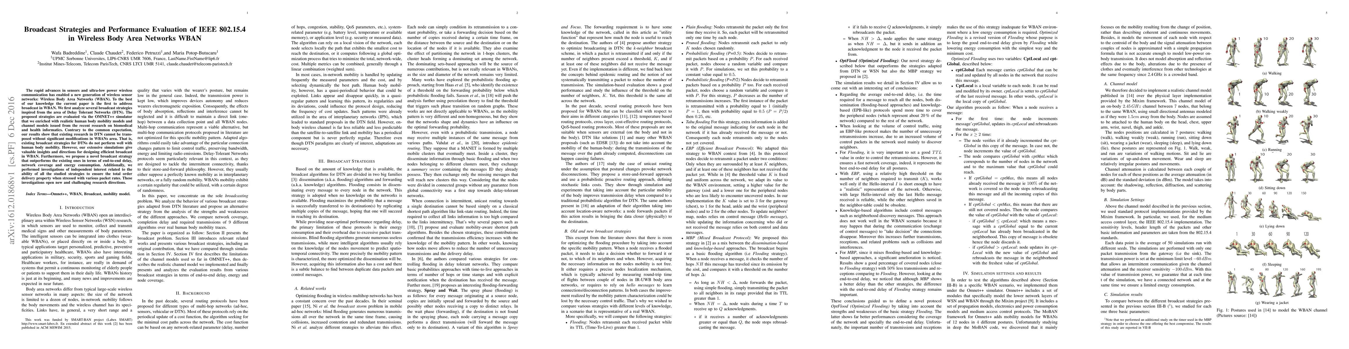This paper investigates broadcast strategies for Wireless Body Area Networks (WBAN) using OMNET++ simulations enriched with realistic human body mobility and channel models. Contrary to expectations, existing Delay Tolerant Network (DTN) broadcast strategies do not perform well in WBAN due to human mobility, but the study proposes a novel strategy that outperforms others in delay, coverage, and energy consumption.