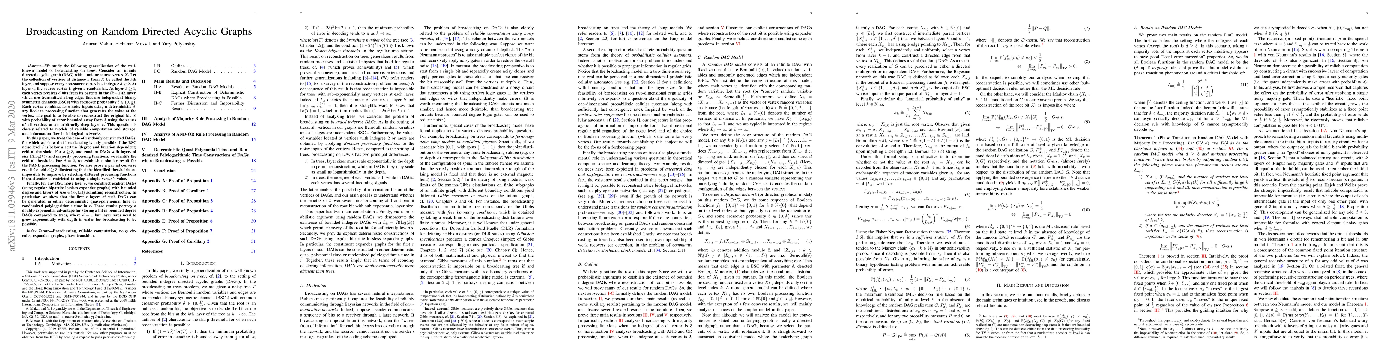 We study a generalization of the well-known model of broadcasting on trees. Consider a directed acyclic graph (DAG) with a unique source vertex $X$, and suppose all other vertices have indegree $d\geq 2$. Let the vertices at distance $k$ from $X$ be called layer $k$. At layer $0$, $X$ is given a random bit. At layer $k\geq 1$, each vertex receives $d$ bits from its parents in layer $k-1$, which are transmitted along independent binary symmetric channel edges, and combines them using a $d$-ary Boolean processing function. The goal is to reconstruct $X$ with probability of error bounded away from $1/2$ using the values of all vertices at an arbitrarily deep layer. This question is closely related to models of reliable computation and storage, and information flow in biological networks. In this paper, we analyze randomly constructed DAGs, for which we show that broadcasting is only possible if the noise level is below a certain degree and function dependent critical threshold. For $d\geq 3$, and random DAGs with layer sizes $\Omega(\log k)$ and majority processing functions, we identify the critical threshold. For $d=2$, we establish a similar result for NAND processing functions. We also prove a partial converse for odd $d\geq 3$ illustrating that the identified thresholds are impossible to improve by selecting different processing functions if the decoder is restricted to using a single vertex. Finally, for any noise level, we construct explicit DAGs (using expander graphs) with bounded degree and layer sizes $\Theta(\log k)$ admitting reconstruction. In particular, we show that such DAGs can be generated in deterministic quasi-polynomial time or randomized polylogarithmic time in the depth. These results portray a doubly-exponential advantage for storing a bit in DAGs compared to trees, where $d=1$ but layer sizes must grow exponentially with depth in order to enable broadcasting.