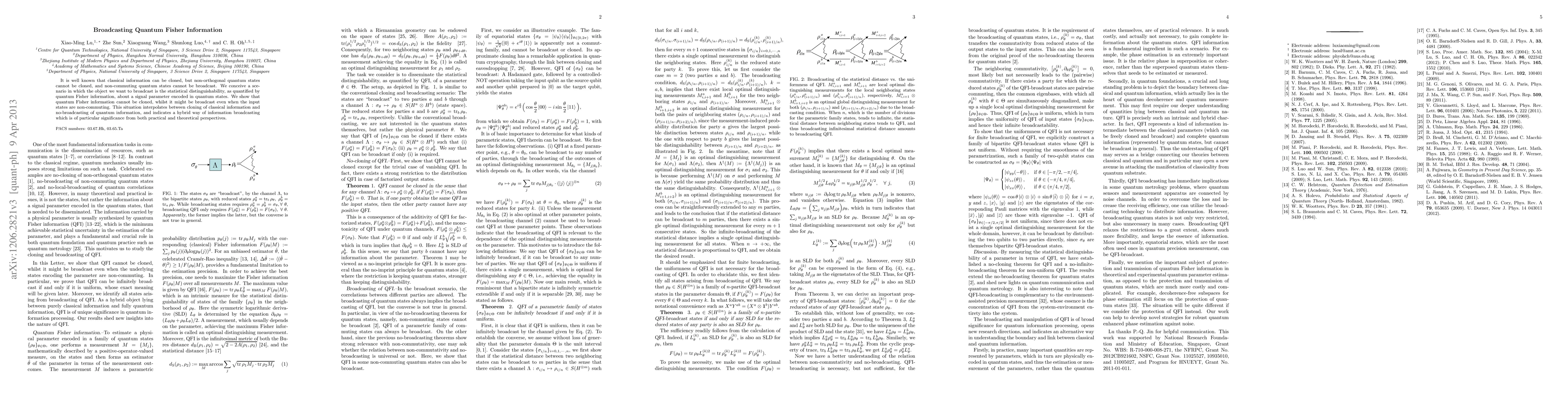 This paper explores the broadcasting of quantum Fisher information, which quantifies the distinguishability of signal parameters encoded in quantum states. While classical information can be cloned, quantum Fisher information cannot be cloned but can potentially be broadcast even for non-commuting states, presenting a unique hybrid method of information transmission.