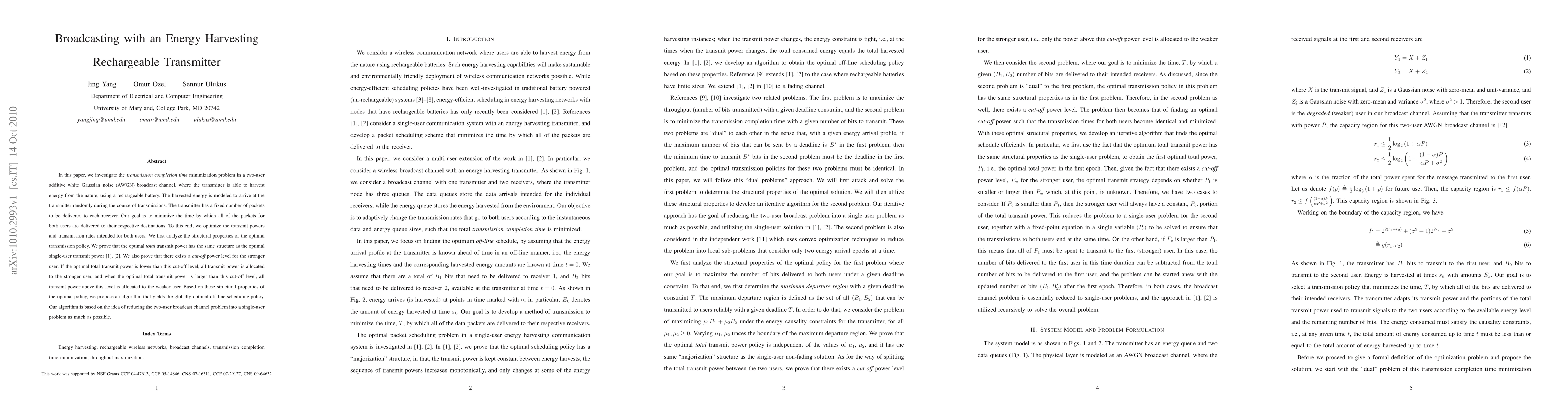 In this paper, we investigate the transmission completion time minimization problem in a two-user additive white Gaussian noise (AWGN) broadcast channel, where the transmitter is able to harvest energy from the nature, using a rechargeable battery. The harvested energy is modeled to arrive at the transmitter randomly during the course of transmissions. The transmitter has a fixed number of packets to be delivered to each receiver. Our goal is to minimize the time by which all of the packets for both users are delivered to their respective destinations. To this end, we optimize the transmit powers and transmission rates intended for both users. We first analyze the structural properties of the optimal transmission policy. We prove that the optimal total transmit power has the same structure as the optimal single-user transmit power. We also prove that there exists a cut-off power level for the stronger user. If the optimal total transmit power is lower than this cut-off level, all transmit power is allocated to the stronger user, and when the optimal total transmit power is larger than this cut-off level, all transmit power above this level is allocated to the weaker user. Based on these structural properties of the optimal policy, we propose an algorithm that yields the globally optimal off-line scheduling policy. Our algorithm is based on the idea of reducing the two-user broadcast channel problem into a single-user problem as much as possible.