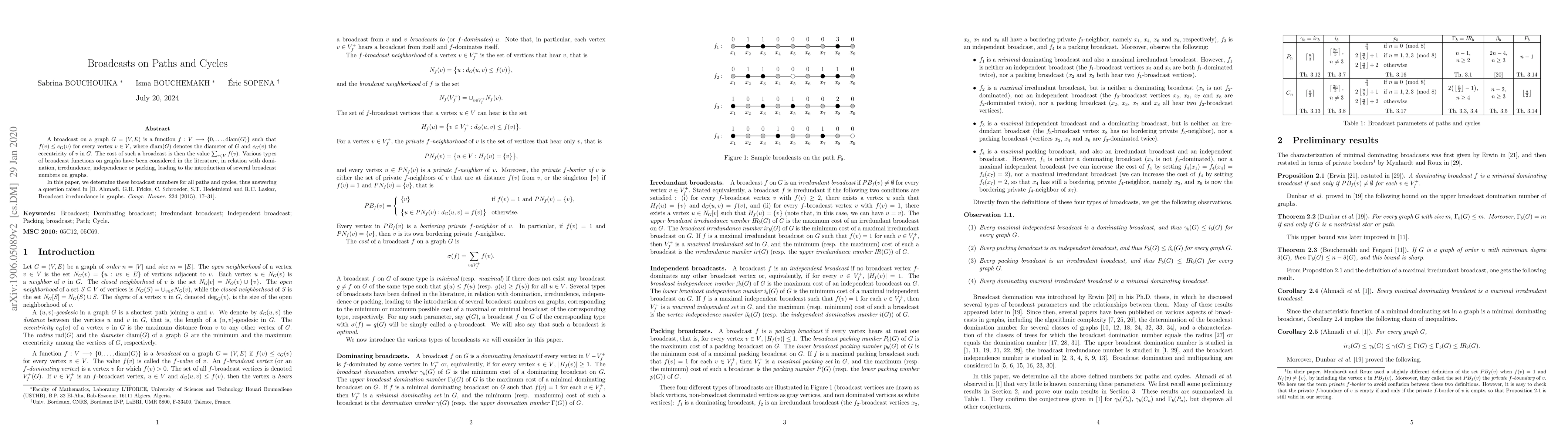 A broadcast on a graph $G=(V,E)$ is a function $f: V\longrightarrow \{0,\ldots,\operatorname{diam}(G)\}$ such that $f(v)\leq e\_G(v)$ for every vertex $v\in V$, where$\operatorname{diam}(G)$ denotes the diameter of $G$ and $e\_G(v)$ the eccentricity of $v$ in $G$. The cost of such a broadcast is then the value $\sum\_{v\in V}f(v)$.Various types of broadcast functions on graphs have been considered in the literature, in relation with domination, irredundence, independenceor packing, leading to the introduction of several broadcast numbers on graphs.In this paper, we determine these broadcast numbers for all paths and cycles, thus answering a questionraised in [D.~Ahmadi, G.H.~Fricke, C.~Schroeder, S.T.~Hedetniemi and R.C.~Laskar, Broadcast irredundance in graphs. {\it Congr. Numer.} 224 (2015), 17--31].