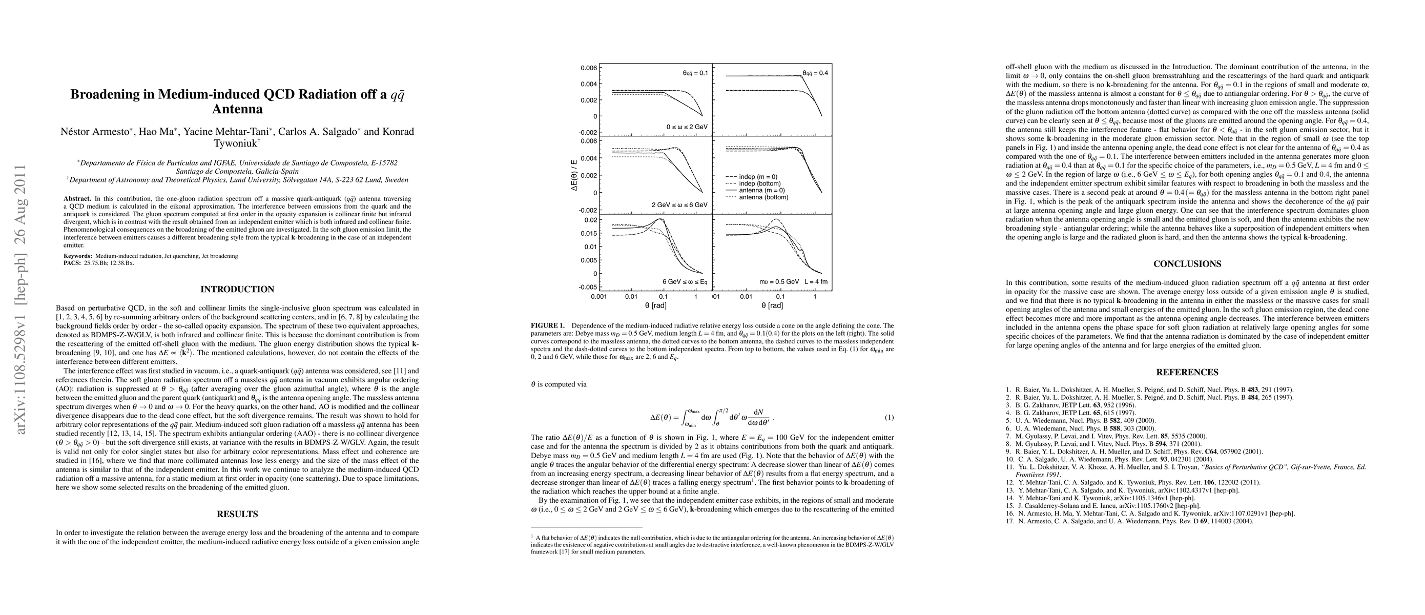 In this contribution, the one-gluon radiation spectrum off a massive quark-antiquark ($q {\bar q}$) antenna traversing a QCD medium is calculated in the eikonal approximation. The interference between emissions from the quark and the antiquark is considered. The gluon spectrum computed at first order in the opacity expansion is collinear finite but infrared divergent, which is in contrast with the result obtained from an independent emitter which is both infrared and collinear finite. Phenomenological consequences on the broadening of the emitted gluon are investigated. In the soft gluon emission limit, the interference between emitters causes a different broadening style from the typical {\bf k}-broadening in the case of an independent emitter.