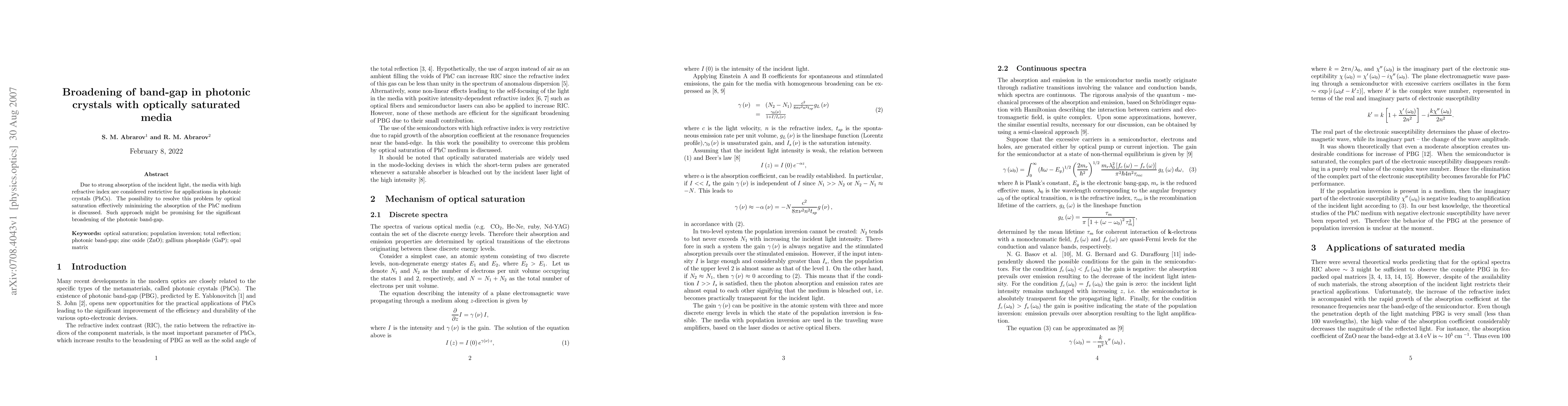 Summary: This paper explores how optical saturation can minimize light absorption in high refractive index media, potentially broadening the photonic band-gap in photonic crystals and offering a solution for their restrictive applications.