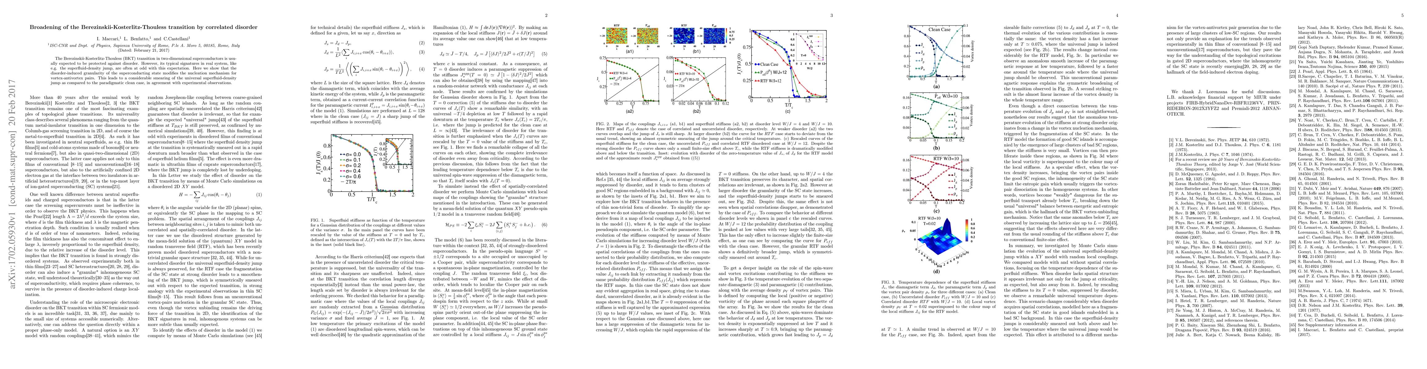 The Berezinskii-Kosterlitz-Thouless (BKT) transition in two-dimensional superconductors is broadened by correlated disorder, altering the nucleation mechanism for vortex-antivortex pairs and significantly smearing the superfluid-density jump, aligning with experimental observations.